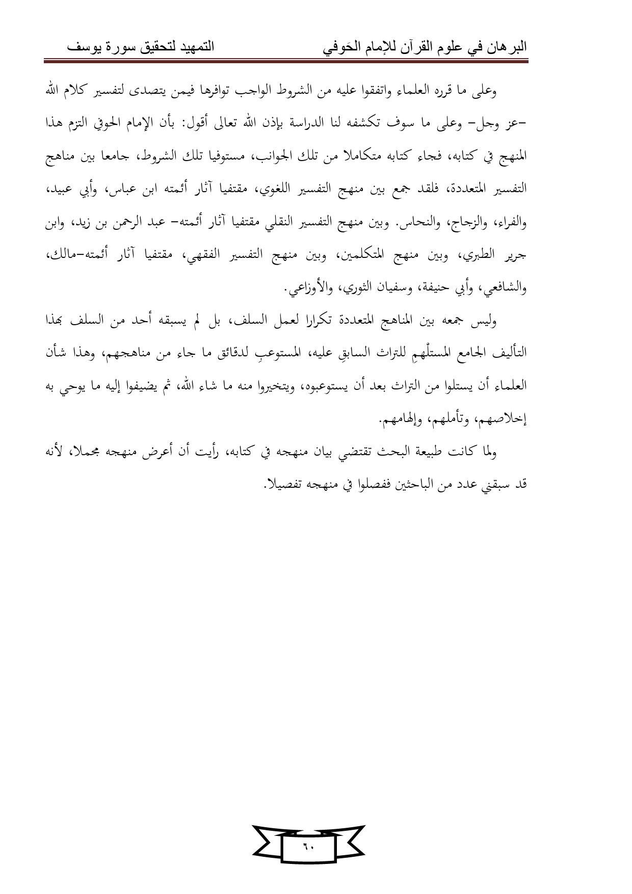 وعلى ما قرره العلماء واتفقوا عليه من الشروط الواجب توافرها فيمن يتصدى لتفسير كلام الله -عز وجل- وعلى ما سوف تكشفه لنا الدراسة بإذن الله تعالى أقول: بأن الإمام الحوفي التزم هذا المنهج في كتابه، فجاء كتابه متكاملا من تلك الجوانب، مستوفيا تلك الشروط، جامعا بين مناهج التفسير المتعددة، فلقد جمع بين منهج التفسير اللغوي، مقتفيا آثار أئمته ابن عباس، وأبي عبيد، والفراء، والزجاج، والنحاس. وبين منهج التفسير النقلي مقتفيا آثار أئمته- عبد الرحمن بن زيد، وابن جرير الطبري، وبين منهج المتكلمين، وبين منهج التفسير الفقهي، مقتفيا آثار أئمته-مالك، والشافعي، وأبي حنيفة، وسفيان الثوري، والأوزاعي.