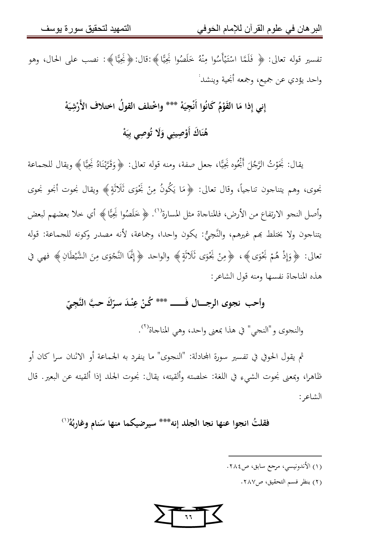 ثم يقول الحوفي في تفسير سورة المجادلة: "النجوى" ما ينفرد به الجماعة أو الاثنان سرا كان أو ظاهرا، وبمعنى نجوت الشيء في اللغة: خلصته وألقيته، يقال: نجوت الجلد إذا ألقيته عن البعير. قال الشاعر: