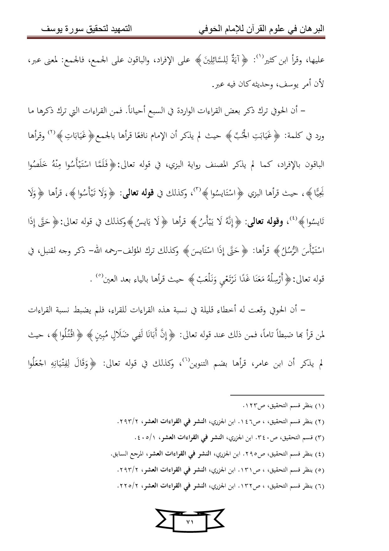 (¬5) ينظر قسم التحقيق،، ص 131. ابن الجزري، النشر في القراءات العشر، 2/ 293.