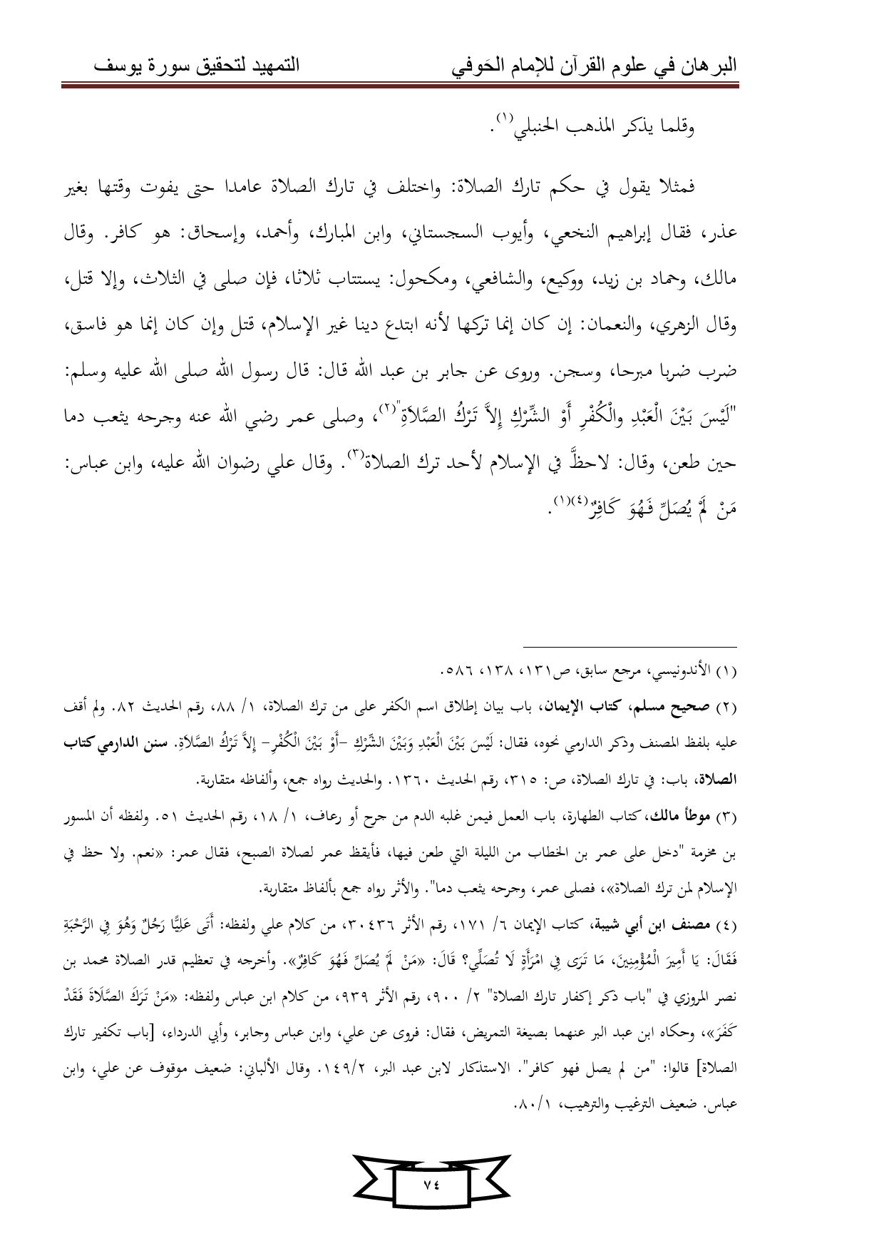 فمثلا يقول في حكم تارك الصلاة: واختلف في تارك الصلاة عامدا حتى يفوت وقتها بغير عذر، فقال إبراهيم النخعي، وأيوب السجستاني، وابن المبارك، وأحمد، وإسحاق: هو كافر. وقال مالك، وحماد بن زيد، ووكيع، والشافعي، ومكحول: يستتاب ثلاثا، فإن صلى في الثلاث، وإلا قتل، وقال الزهري، والنعمان: إن كان إنما تركها لأنه ابتدع دينا غير الإسلام، قتل وإن كان إنما هو فاسق، ضرب ضربا مبرحا، وسجن. وروى عن جابر بن عبد الله قال: قال رسول الله صلى الله عليه وسلم: "لَيْسَ بَيْنَ الْعَبْدِ والْكُفْرِ أَوْ الشِّرْكِ إِلاَّ تَرْكُ الصَّلاَةِ" (¬2)، وصلى عمر رضي الله عنه وجرحه يثعب دما حين طعن، وقال: لاحظَّ في الإسلام لأحد ترك الصلاة (¬3). وقال علي رضوان الله عليه، وابن عباس: مَنْ لَمْ يُصَلِّ فَهُوَ كَافِرٌ (¬4)
