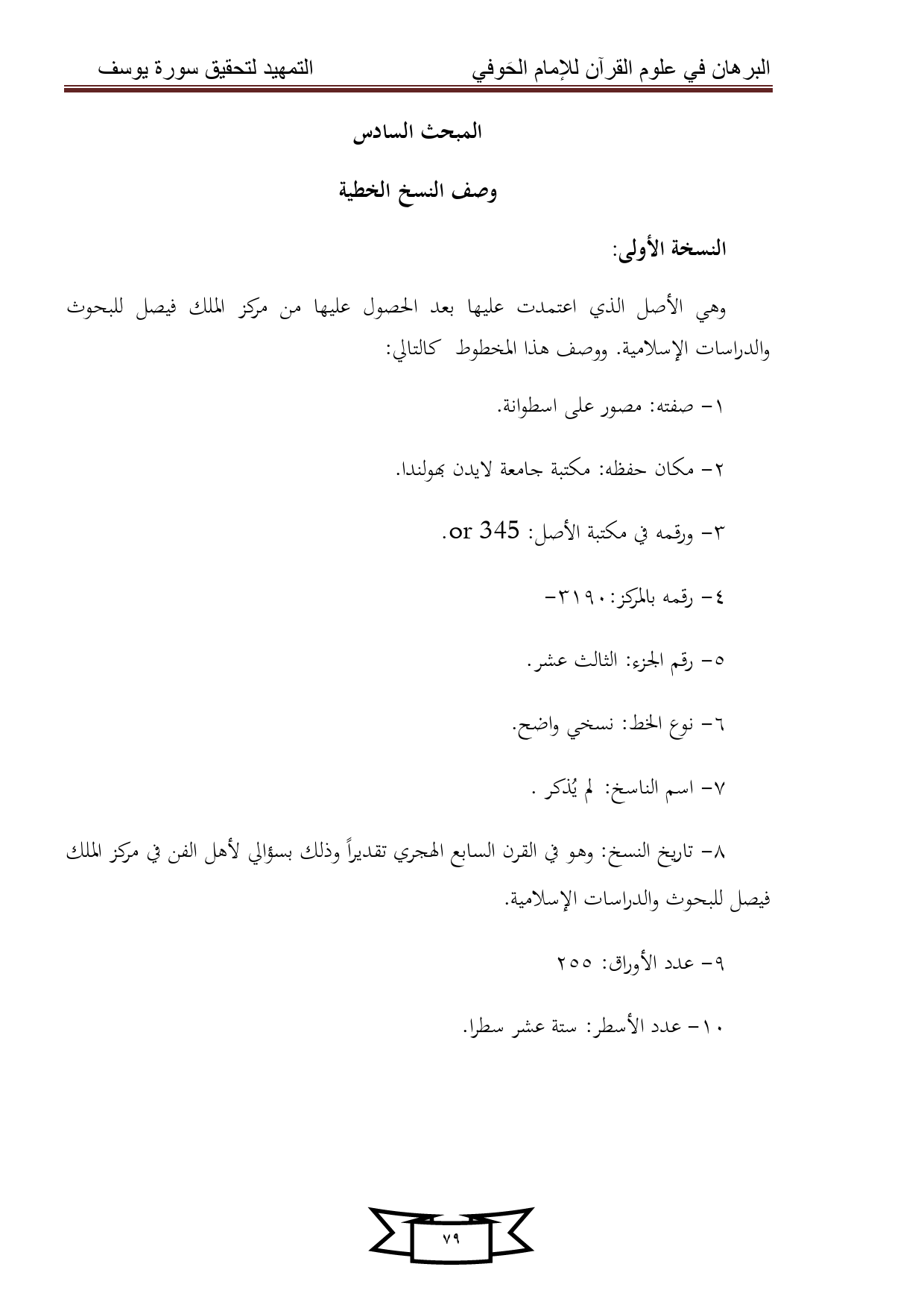 وهي الأصل الذي اعتمدت عليها بعد الحصول عليها من مركز الملك فيصل للبحوث والدراسات الإسلامية. ووصف هذا المخطوط كالتالي: