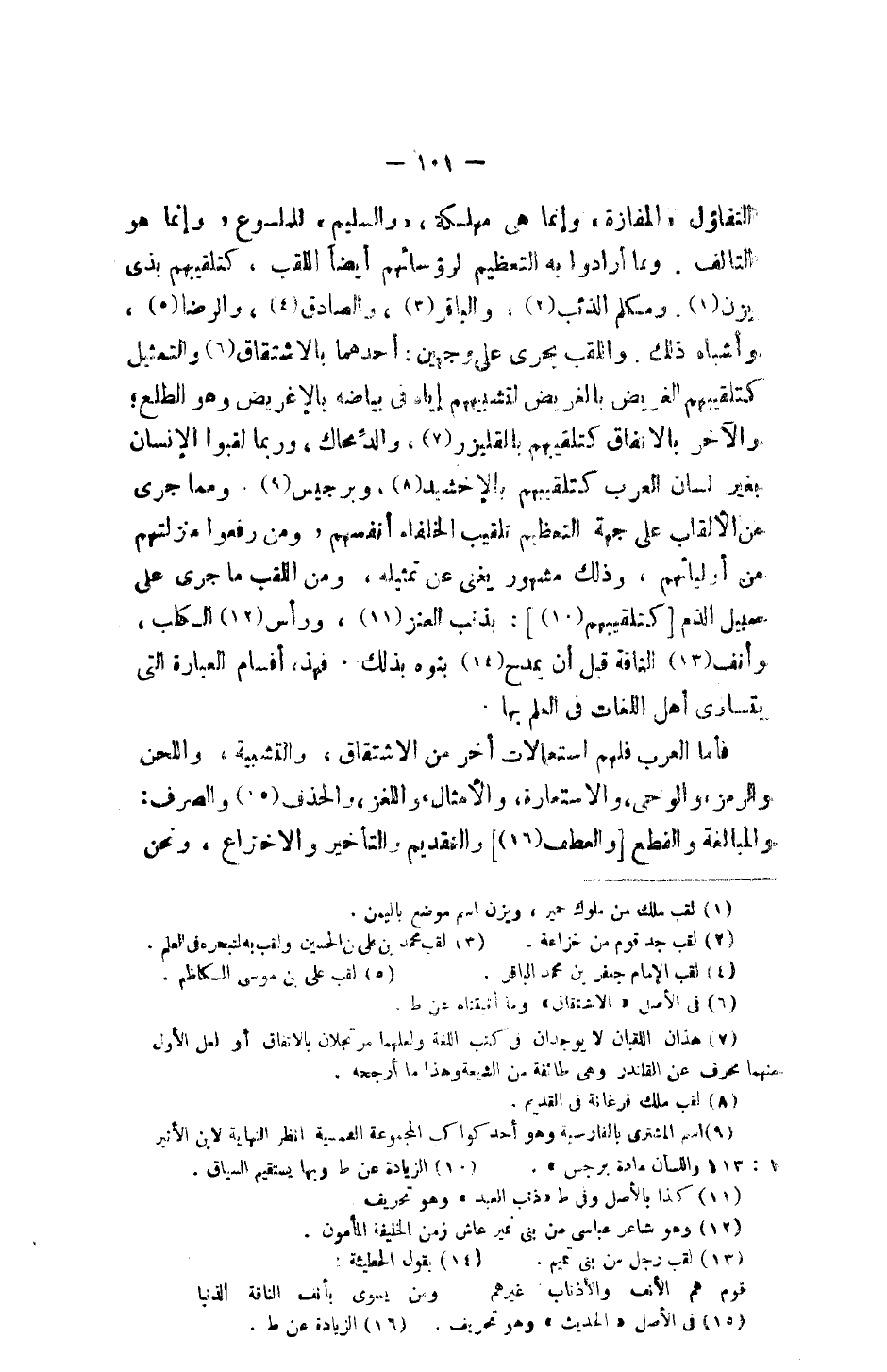 التفاؤل "المفازة" وإنما هي مهلكة" "والسليم" الملموع، وإنما هو التآلف. ومما أرادوا به التعظيم لرؤسائهم أيضاً اللقب، كتلقيبهم بذي يزن. ومكلم الذئب، والباقر، والصادق، والرضا، وأشباه ذلك، واللقب يجري على وجهين: أحدهما بالاشتقاق والتمثيل كتلقيبهم الغريض بالغريض لتشبيههم إياه في بياضه بالإغريض وهو الطلع؛ والآخر بالاتفاق كتلقيبهم بالقليزر، والدمحاك، وربما لقبوا الإنسان بغير لسان العرب كتلقيبهم بالإخشيد، وبرجيس. ومما جرى من الألقاب على جهة التعظيم تلقيب الخلفاء أنفسهم، ومن رفعوا منزلتهم من أوليائهم، وذلك مشهور يغني عن تمثيله، ومن اللقب ما جرى على سبيل الذم [كتلقيبهم]: بذنب العذر، ورأس الكلب، وأنف الناقة قبل أن يمدح بنوه بذلك. فهذا، أقسام للعبارة التي يتسارى أهل اللغات في العلم بها.