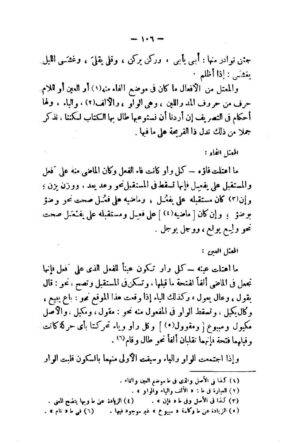 ما اعتلت عينه - كل واو تكون عيناً للفعل الذي على فعل فإنها تجعل في الماضي ألفاً لفتحه ما قبلها، وتسكن في المستقبل وتصح، نحو: قال يقول، وعال يعول، وكذلك الياء إذا وقعت هذا الموقع نحو: باع يبيع، وكان يكيل، وتسقط الواو في المفعول منه نحو: مقول، ومكيل، والأصل مكيول ومبيوع [ومقوول] وكل واو وياء تحركتا بأي حركة كانت وقبلهما فتحة فإنهما تقلبان ألفاً نحو طال وقام.