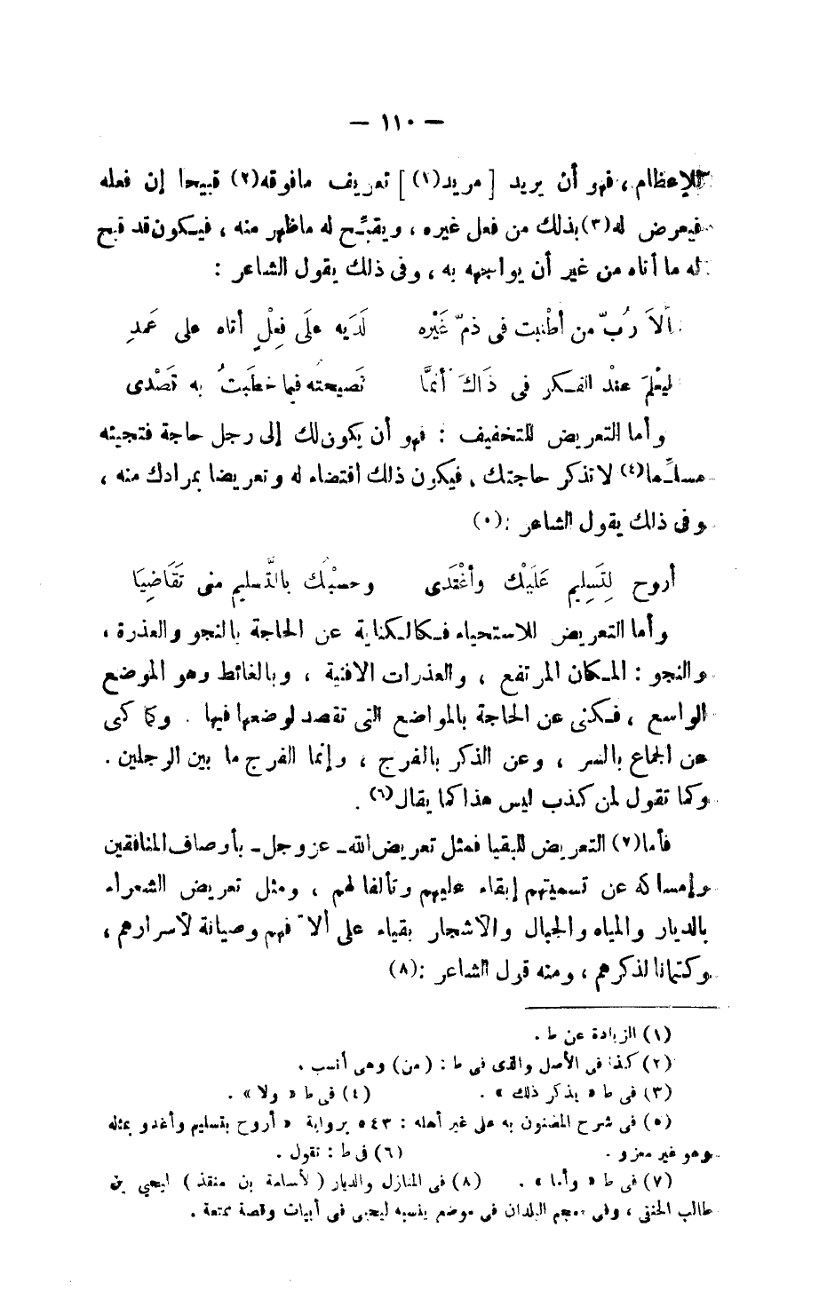 وأما التعريض للاستحياء فكالكتابة عن الحاجة بالنجو والعذرة، والنجو: المكان المرتفع، والعذرات الأفنية، وبالغائط وهو الموضع الواسع، فكنى عن الحاجة بالمواضع التي تقصد لوضعها فيها، وكما كي عن الجماع بالسر، وعن الذكر بالفرج، وإنما الفرج ما بين الرجلين وكما تقول لمن كذب ليس هذا كما يقال.