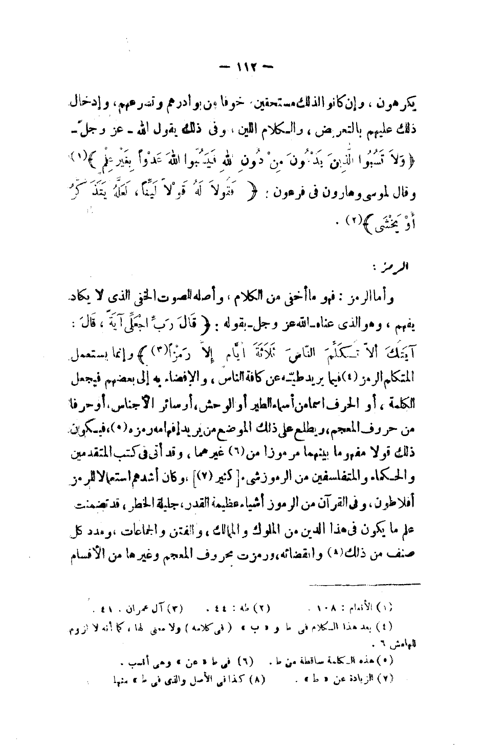 وأما الرمز: فهو ما أخفى من الكلام، وأصله للصوت الخفي الذي لا يكاد يفهم، وهو الذي عناه الله -عز وجل - بقوله: {قَالَ رَبِّ اجْعَلْ لِي آيَةً قَالَ آيَتُكَ أَلَّا تُكَلِّمَ النَّاسَ ثَلاثَةَ أَيَّامٍ إِلَّا رَمْزًا} وإنما يستعمل المتكلم الرمز فيما يريد طيه عن كافة الناس، والإفضاء به إلى بعضهم فيجعل الكلمة، أو الحرف اسماً من أسماء الطير أو الوحش، أو سائر الأجناس، أو حرفاً من حروف المعجم، ويطلع على ذلك الموضع من يريد إفهامه رمزه، فيكون ذلك قولاً مفهوماً بينهما مرموزاً من غيرهما، وقد أتى في كتب المتقدمين والحكماء والمتفلسفين من الرموز شيء [كثير]، وكان أشدهم استعمالاً للرمز أفلاطون، وفي القرآن من الرموز أشياء عظيمة القدر، جليلة الخطر، قد تضمنت علم ما يكون في هذا الدين من الملوك والممالك، والفتن والجماعات، ومدد كل صنف من ذلك وانقضائه، ورمزت بحروف المعجم وغيرها من الأقسام