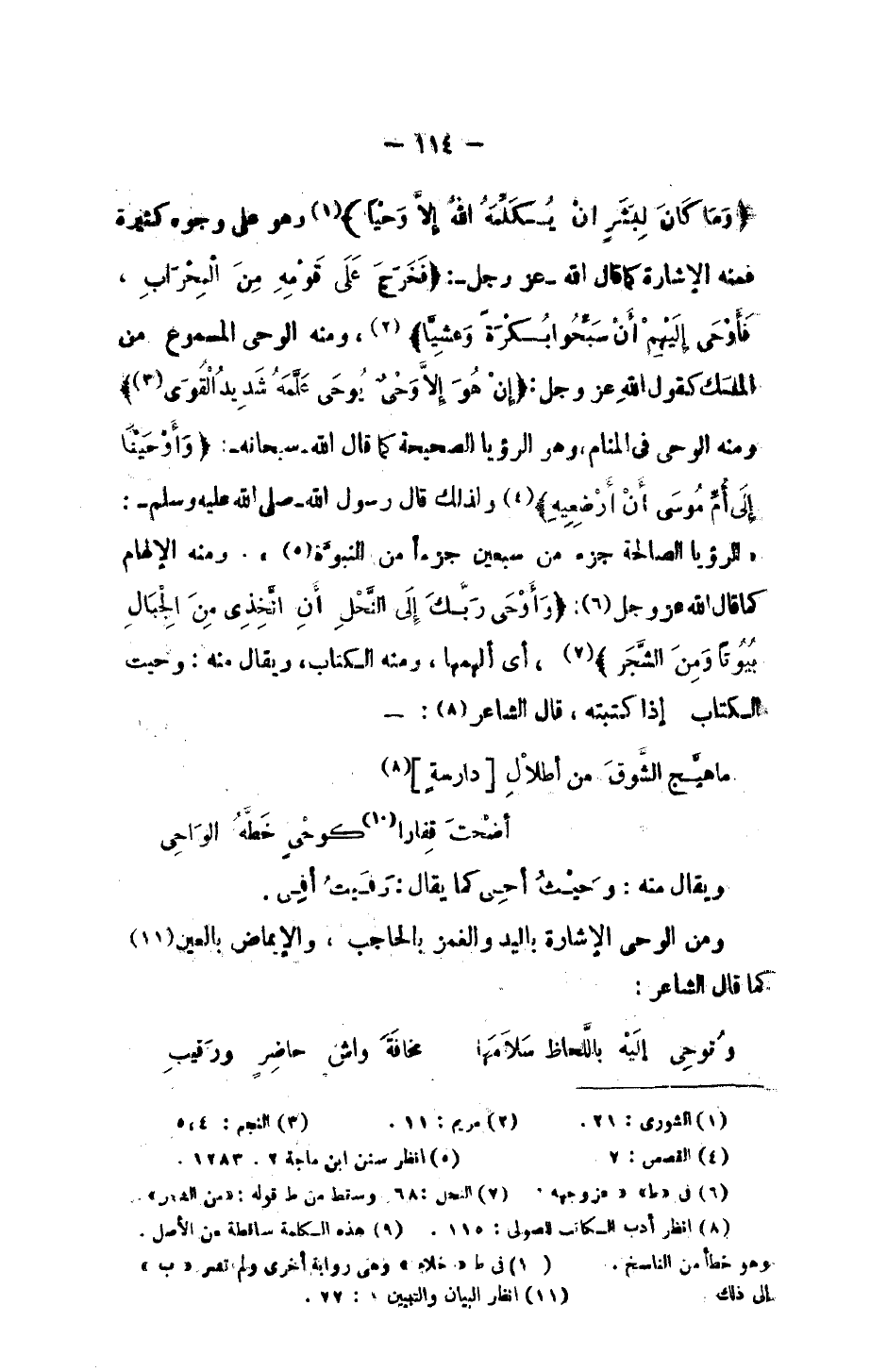 {وَمَا كَانَ لِبَشَرٍ أَنْ يُكَلِّمَهُ اللَّهُ إِلَّا وَحْيًا} وهو على وجوه كثيرة فمنه الإشارة كما قال الله -عز وجل-: {فَخَرَجَ عَلَى قَوْمِهِ مِنَ الْمِحْرَابِ فَأَوْحَى إِلَيْهِمْ أَنْ سَبِّحُوا بُكْرَةً وَعَشِيًّا}، ومنه الوحي المسموع من الملك كقول الله عز وجل: {إِنْ هُوَ إِلَّا وَحْيٌ يُوحَى * عَلَّمَهُ شَدِيدُ الْقُوَى} ومنه الوحي في المنام، وهو الرؤيا الصحيحة كما قال الله -سبحانه-: {وَأَوْحَيْنَا إِلَى أُمِّ مُوسَى أَنْ أَرْضِعِيهِ فَإِذَا خِفْتِ عَلَيْهِ فَأَلْقِيهِ فِي الْيَمِّ} ولذلك قال رسول الله - صلى الله عليه وسلم -: "للرؤيا الصالحة جزء من سبعين جزءاً من النبوة" ومنه الإلهام كما قال الله -عز وجل-: {وَأَوْحَى رَبُّكَ إِلَى النَّحْلِ أَنِ اتَّخِذِي مِنَ الْجِبَالِ بُيُوتًا وَمِنَ الشَّجَرِ}، أي ألهمها، ومن الكتاب، ويقال منه: وحيت الكتاب إذا كتبته، قال الشاعر: