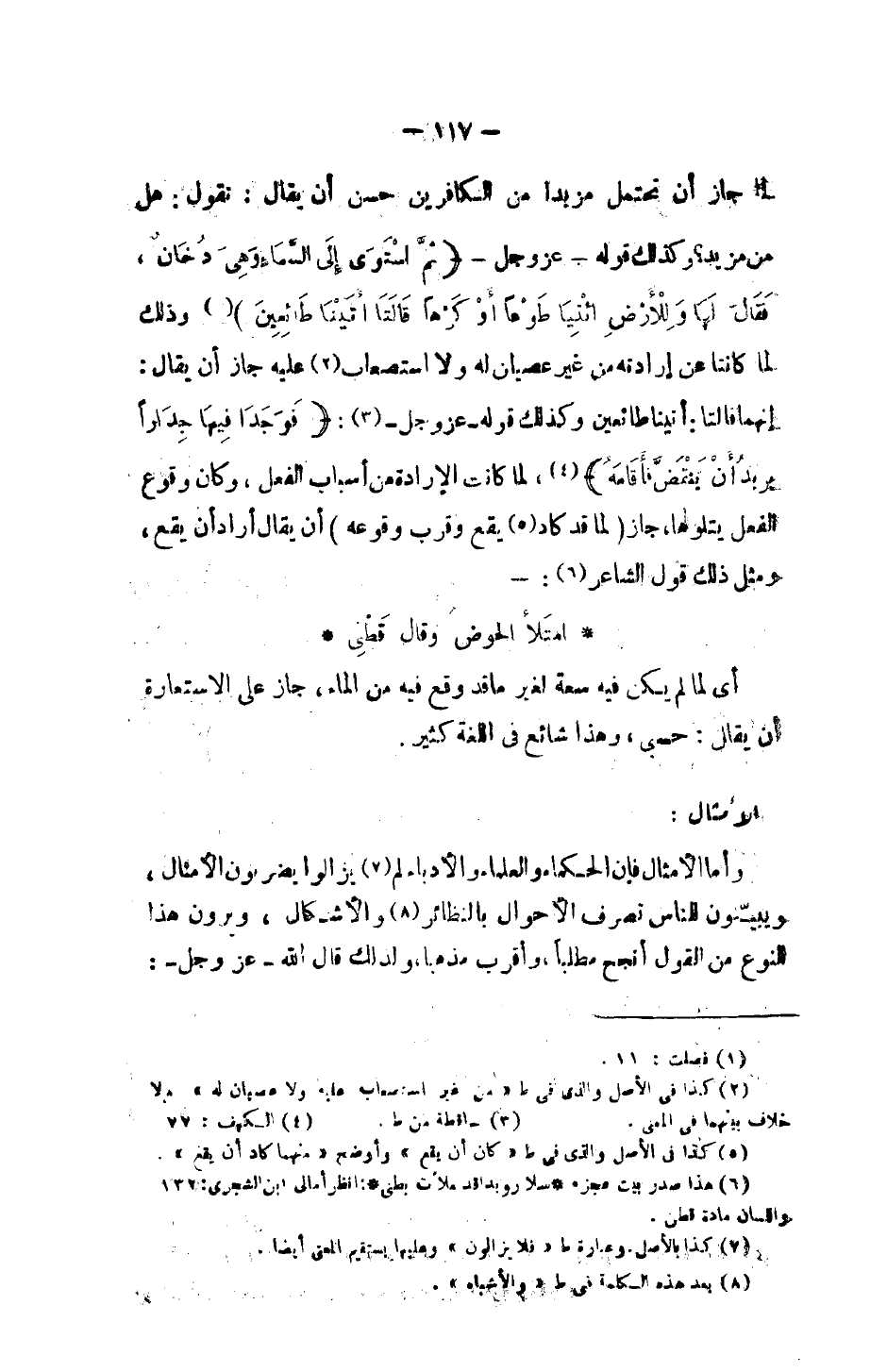 جاز أن تحتمل مزيداً من الكافرين حسن أن يقال: نقول: هل من مزيد؟ وكذلك قوله -عز وجل - {ثُمَّ اسْتَوَى إِلَى السَّمَاءِ وَهِيَ دُخَانٌ فَقَالَ لَهَا وَلِلأَرْضِ اِئْتِيَا طَوْعًا أَوْ كَرْهًا قَالَتَا أَتَيْنَا طَائِعِينَ} وذلك لما كانتا عن إرادته من غير عصيان له ولا استصعاب عليه جاز أن يقال: إنهما قالتا: أتينا طائعين وكذلك قوله -عز وجل-: {فَوَجَدَا فِيهَا جِدَارًا يُرِيدُ أَنْ يَنقَضَّ فَأَقَامَهُ}، لما كانت الإرادة من أسباب الفعل، وكان وقوع الفعل يتلوها، جاز (لما قد كاد يقع وقرب وقوعه) أن يقال أراد أن يقع، ومثل ذلك قول الشاعر: