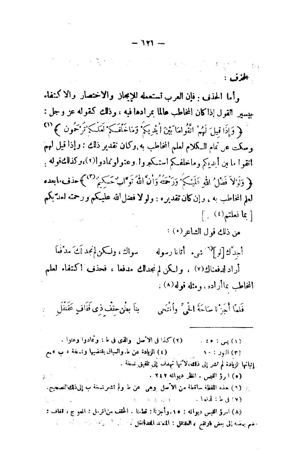 وأما الحذف: فإن العرب تستعمله للإيجاز والاختصار والاكتفاء بيسير القول إذا كان المخاطب عالماً برمادها فيه، وذلك كقوله عز وجل: {وَإِذَا قِيلَ لَهُمُ اتَّقُوا مَا بَيْنَ أَيْدِيكُمْ وَمَا خَلْفَكُمْ لَعَلَّكُمْ تُرْحَمُونَ} وسكت عن تمام الكلام لعلم المخاطب به، وكان تقدير ذلك: وإذا قيل لهم اتقوا ما بين أيديكم وما خلفكم استكبروا وعتوا وتمادوا، وكذلك قوله: {وَلَوْلا فَضْلُ اللَّهِ عَلَيْكُمْ وَرَحْمَتُهُ وَأَنَّ اللَّهَ تَوَّابٌ حَكِيمٌ} حذف ما بعده لعلم المخاطب به، وإن كان تقديره: ولولا فضل الله عليكم ورحمته لعد بكم [بما فعلتم].