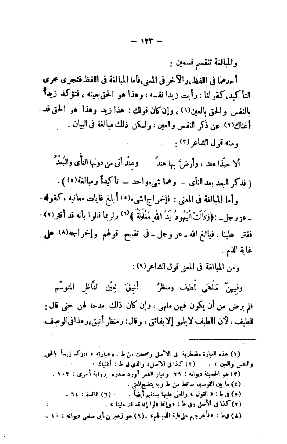 وأما المبالغة في المعنى: فإخراج الشيء أبلغ غايات معانيه، كقوله -عز وجل-: {وَقَالَتِ الْيَهُودُ يَدُ اللَّهِ مَغْلُولَةٌ} ولربما قالوا بأنه قد أقتر فقتر علينا، فبالغ الله -عز وجل - في تقبيح قولهم وإخراجه على غاية الذم.