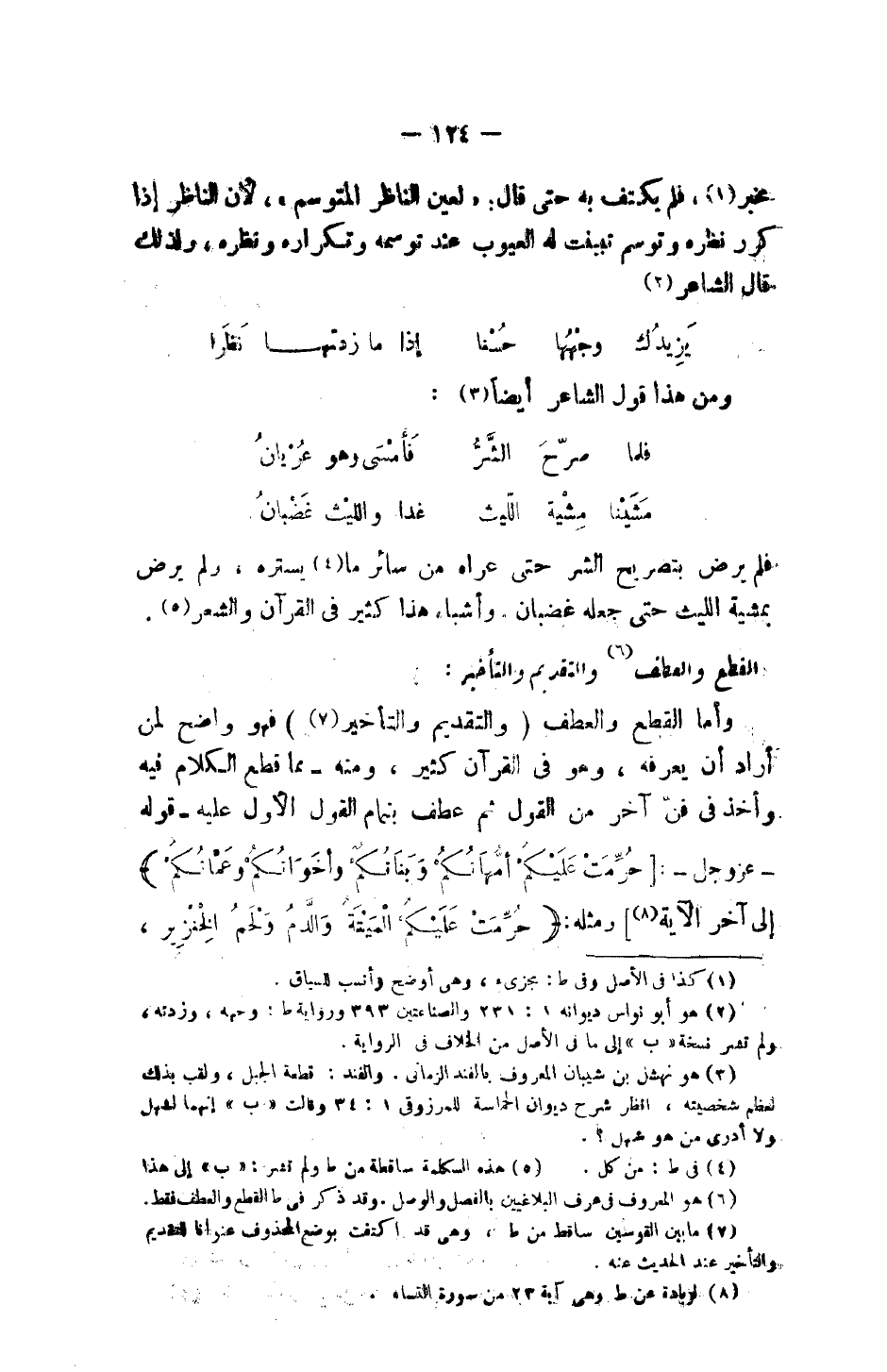 وأما القطع والعطف (والتقديم والتأخير) فو واضح لمن أراد أن يعرفه، وهو في القرآن كثير، ومنه - مما قطع الكلام فيه وأخذ في فن آخر من القول ثم عطف بتمام القول الأول عليه - قوله -عز وجل-: {حُرِّمَتْ عَلَيْكُمْ أُمَّهَاتُكُمْ وَبَنَاتُكُمْ وَأَخَوَاتُكُمْ وَعَمَّاتُكُمْ} إلى آخر الآية] ومثله: {حُرِّمَتْ عَلَيْكُمُ الْمَيْتَةُ وَالدَّمُ وَلَحْمُ الْخِنزِيرِ