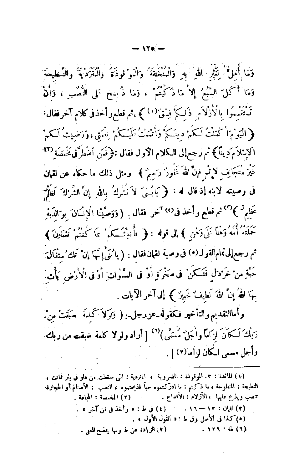 وَمَا أُهِلَّ لِغَيْرِ اللَّهِ بِهِ وَالْمُنْخَنِقَةُ وَالْمَوْقُوذَةُ وَالْمُتَرَدِّيَةُ وَالنَّطِيحَةُ وَمَا أَكَلَ السَّبُعُ إِلَّا مَا ذَكَّيْتُمْ وَمَا ذُبِحَ عَلَى النُّصُبِ وَأَنْ تَسْتَقْسِمُوا بِالأَزْلامِ ذَلِكُمْ فِسْقٌ} ثم قطع وأخذ في كلام آخر فقال: {الْيَوْمَ أَكْمَلْتُ لَكُمْ دِينَكُمْ وَأَتْمَمْتُ عَلَيْكُمْ نِعْمَتِي وَرَضِيتُ لَكُمُ الإِسْلامَ دِينًا} ثم رجع إلى الكلام الأول فقال: {فَمَنِ اضْطُرَّ فِي مَخْمَصَةٍ غَيْرَ مُتَجَانِفٍ لِإِثْمٍ فَإِنَّ اللَّهَ غَفُورٌ رَحِيمٌ} ومثل ذلك ما حكاه عن لقمان في وصيته لابنه إذ قال له: {يَا بُنَيَّ لا تُشْرِكْ بِاللَّهِ إِنَّ الشِّرْكَ لَظُلْمٌ عَظِيمٌ} ثم قطع وأخذ في آخر فقال: {وَوَصَّيْنَا الإِنسَانَ بِوَالِدَيْهِ حَمَلَتْهُ أُمُّهُ وَهْنًا عَلَى وَهْنٍ} إلى قوله: {فَأُنَبِّئُكُمْ بِمَا كُنتُمْ تَعْمَلُونَ} ثم رجع إلى تمام القول في وصية لقمان فقال: {يَا بُنَيَّ إِنَّهَا إِنْ تَكُ مِثْقَالَ حَبَّةٍ مِنْ خَرْدَلٍ فَتَكُنْ فِي صَخْرَةٍ أَوْ فِي السَّمَوَاتِ أَوْ فِي الأَرْضِ يَاتِ بِهَا اللَّهُ إِنَّ اللَّهَ لَطِيفٌ خَبِيرٌ} إلى آخر الآيات.