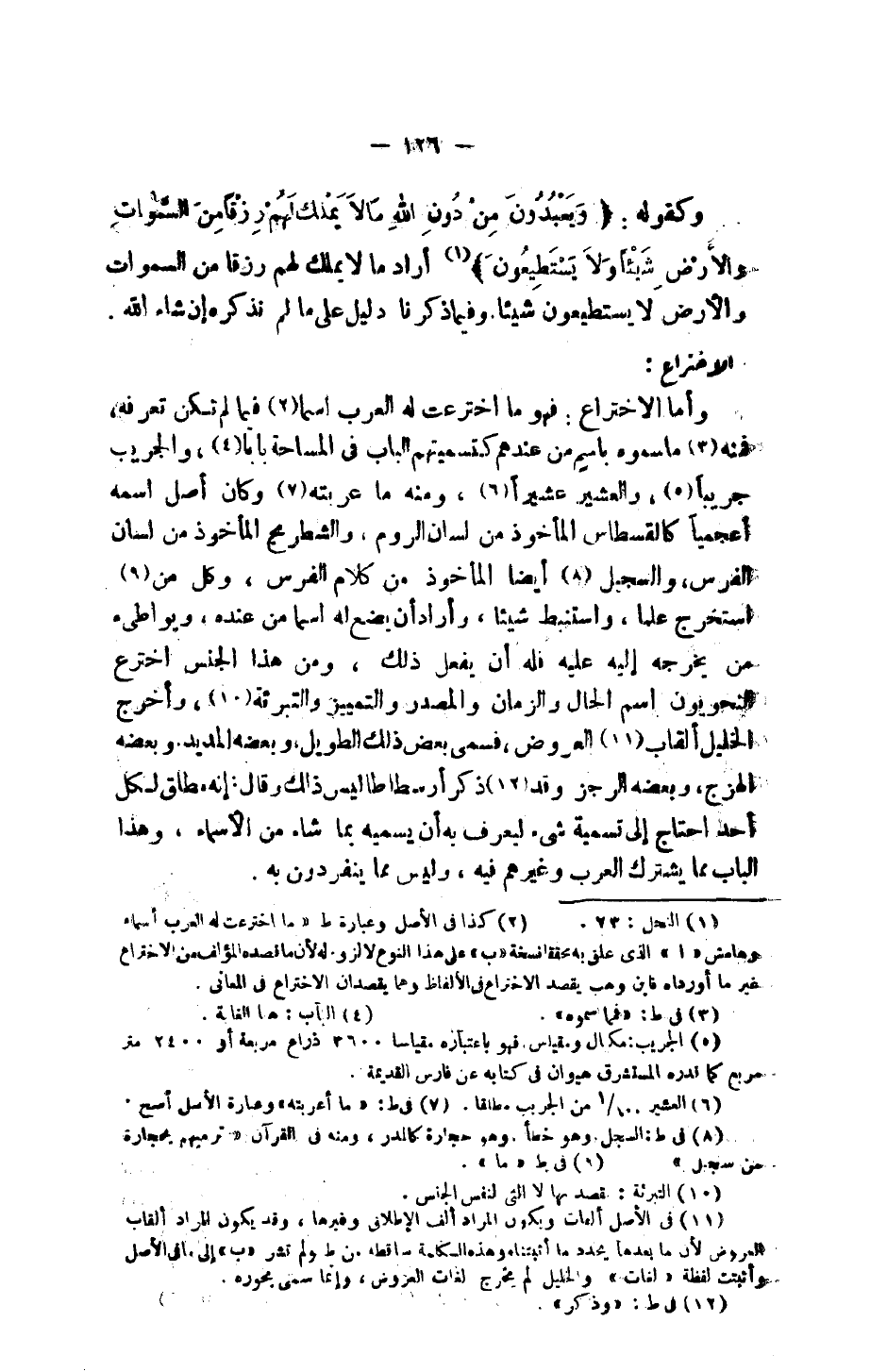 وأما الاختراع: فهو ما اخترعت له العرب اسماً فيما لم تكن تعرفه، فمنه ما سموه من عندهم كتسميتهم الباب في المساحة باباً، والجريب جريباً، والعشير عشيراً، ومنه ما عربته وكان أصل اسمه أعجمياً كالقسطاس المأخوذ من لسان الروم، والشطرنج المأخوذ من لسان الفرس والسجيل أيضاً المأخوذ من كلام الفرس، وكل من استخرج علماً، واستنبط شيئاً، وأراد أن يضع له اسماً من عنده، ويواطئ من يخرجه إليه عليه فله أن يفعل ذلك، ومن هذا الجنس اخترع النحويون اسم الحال والزمان والمصدر والتمييز والتبرئة، وأخرج الخليل ألقاب العروض، فسمى بعض ذلك الطويل، وبعضه المديد وبعضه الهزج، وبعضه الزجر وقد ذكر أرسطا طاليس ذلك وقال: إنه مطلق لكل أحد احتاج إلى تسمية شيء ليعرف به أن يسميه بما شاء من الأسماء، وهذا الباب مما يشترك العرب وغيرهم فيه، وليس مما ينفردون به.