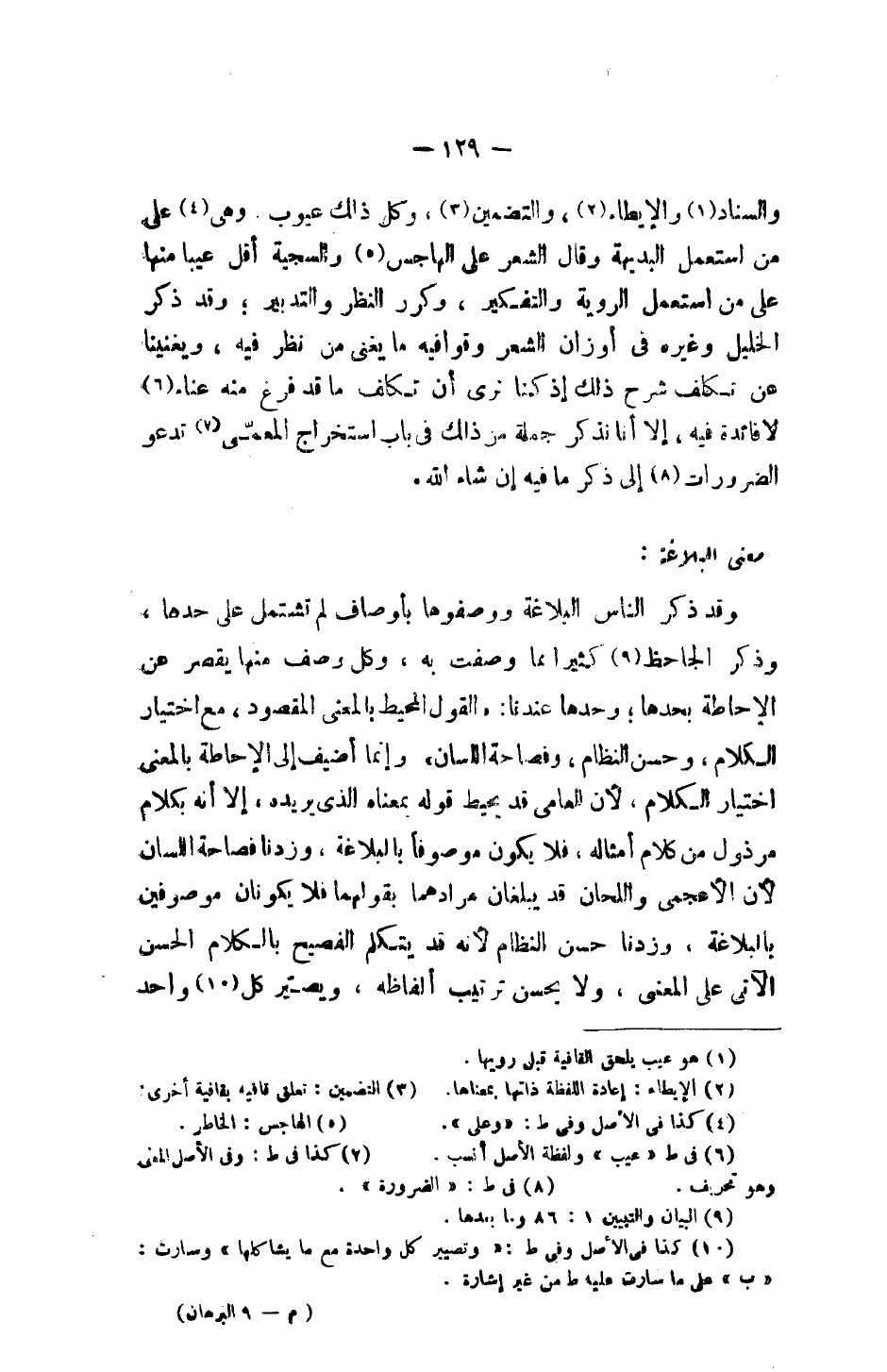 والسناد والإيطاء، والتضمين، وكل ذلك عيوب وهي على من استعمل البديهة وقال الشعر على الهاجس والسجية أقل عيباً منها على من استعمل الروية والتفكير، وكرر النظر والتدبير؛ وقد ذكر الخليل وغيره في أوزان الشعر وقوافيه ما يغني من نظر فيه، ويغنينا عن تكلف شرح ذلك إذ كنا نرى أن تكلف ما قد فرغ منه عناء لا فائدة فيه، إلا أنا نذكر جملة من ذلك في باب استخراج المعمى تدعو الضرورات إلى ذكر ما فيه إن شاء الله.