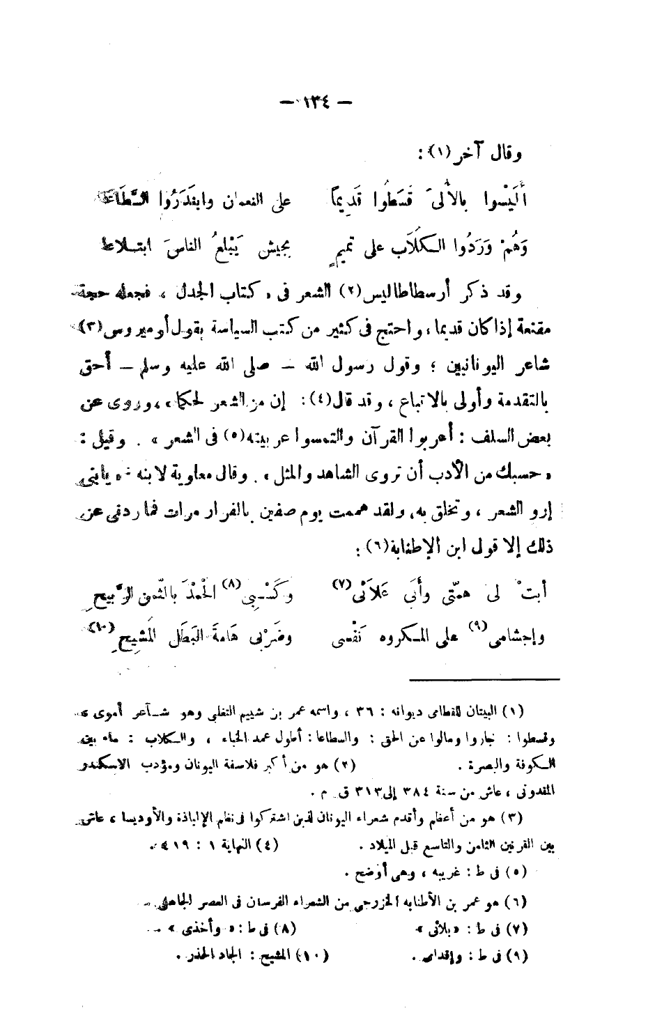 وقد ذكر أرسطاطاليس الشعر في "كتاب الجدل"، فجعله حجة مقنعة إذا كان قديماً، واحتج في كثير من كتب السياسة بقول أوميروس شاعر اليونانيين؛ وقول رسول الله -صلى الله عليه وسلم - أحق بالتقدمة وأولى بالأتباع، وقد قال: إن من الشعر لحكما، وروى عن بعض السلف: أعربوا القرآن والتمسوا عربيته في الشعر". وقيل: "حسبك من الأدب أن تروي الشاهد والمثل". وقال معاوية لابنه: "يا بي إرو الشعر، وتخلق به، ولقد هممت يوم صفين بالفرار مرات فما ردفي عن ذلك غلا قول ابن الإطنابة: