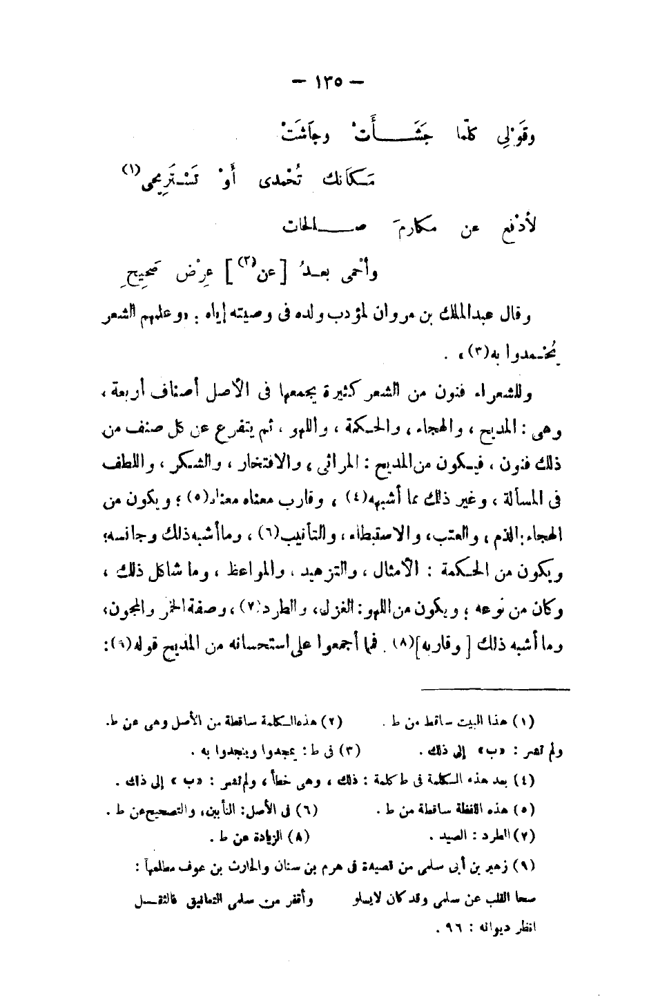 وللشعراء فنون من الشعر كثيرة يجمعها في الأصل أصناف أربعة، وهي: المديح، والهجاء، والحكمة، واللهو، ثم يتفرع عن كل صنف من ذلك فنون، فيكون من المديح: المرائي، والافتخار، والشكر، واللطف في المسألة، وغير ذلك مما اشبهه، وقارب معناه معناه؛ ويكون من الهجاء: الذم، والعتب، والاستبطاء، والتأنيب، وما أشبه ذلك وجانسه؛ ويكون من الحكمة: الأمثال، والتزهيد، والمواعظ، وما شاكل ذلك، وكان من نوعه؛ ويكون من اللهو: الغزل، والطرد، وصفة الخمر والمجون، وما أشبه ذلك [وقاربه]. فما أجمعوا على استحسانه من المديح قوله: