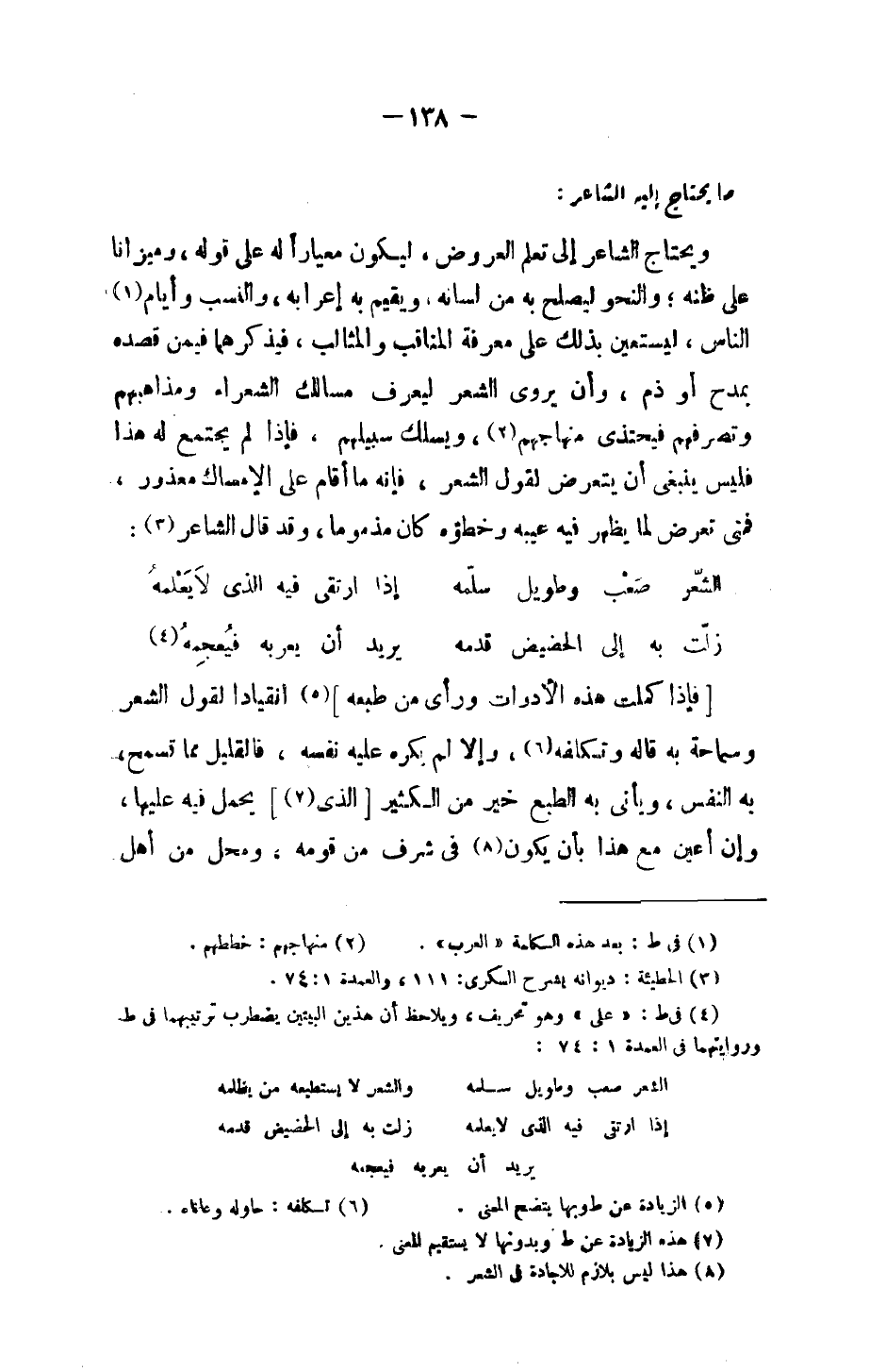 ويحتاج الشاعر إلى تعلم العروض، ليكون معياراً له على قوله، وميزاناً على ظنه؛ والنحو ليصلح به من لسانه، ويقيم به إعرابه، والنسب وأيام الناس، ليستعين بذلك على معرفة المناقب والمثالب، فيذكرهما فيمن قصده بمدح أو ذم، وأن يروى الشعر ليعرف مسالك الشعراء ومذاهبهم وتصرفهم فيحتذي مناهجهم، ويسلك سبيلهم، فإذا لم يجتمع له هذا فليس ينبغي أن يتعرض لقول الشعر، فإنه ما أقام على الإمساك معذور، فمتى تعرض لما يظهر فيه عيبه وخطؤه كان مذموماً، وقد قال الشاعر: