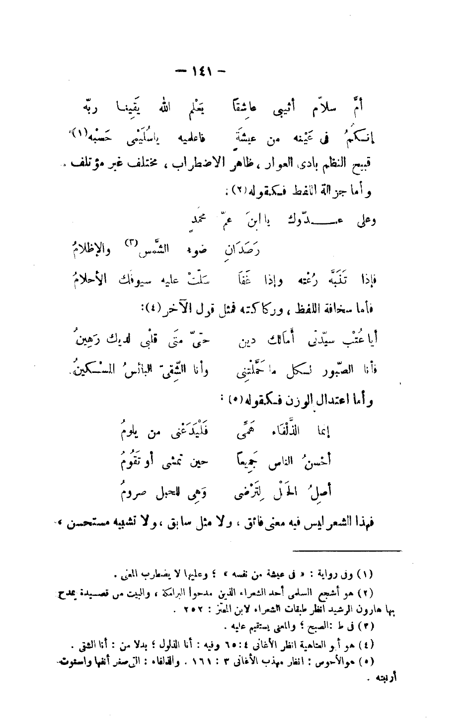 قبيح النظم بادي العوار، ظاهر الاضطراب، مختلف غير مؤتلف. وأما جزالة اللفظ فكقوله: