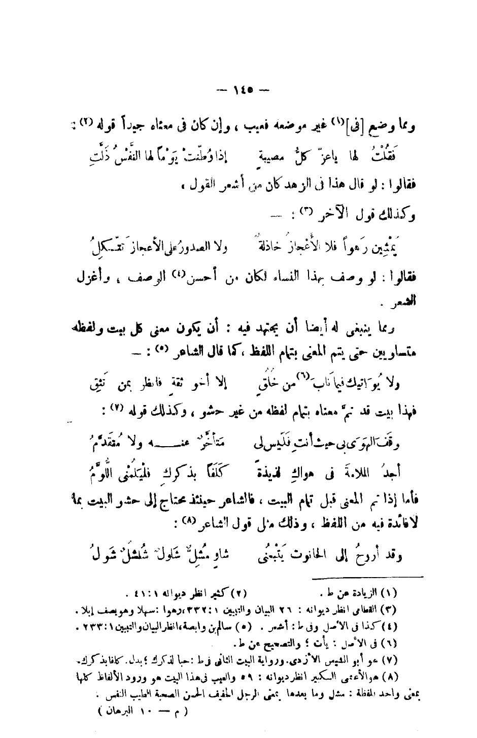 ومما ينبغي له أيضاً أن يجتهد فيه: أن يكون معنى كل بيت ولفظه متساويين حتى يتم المعنى بتمام اللفظ، كما قال الشاعر: