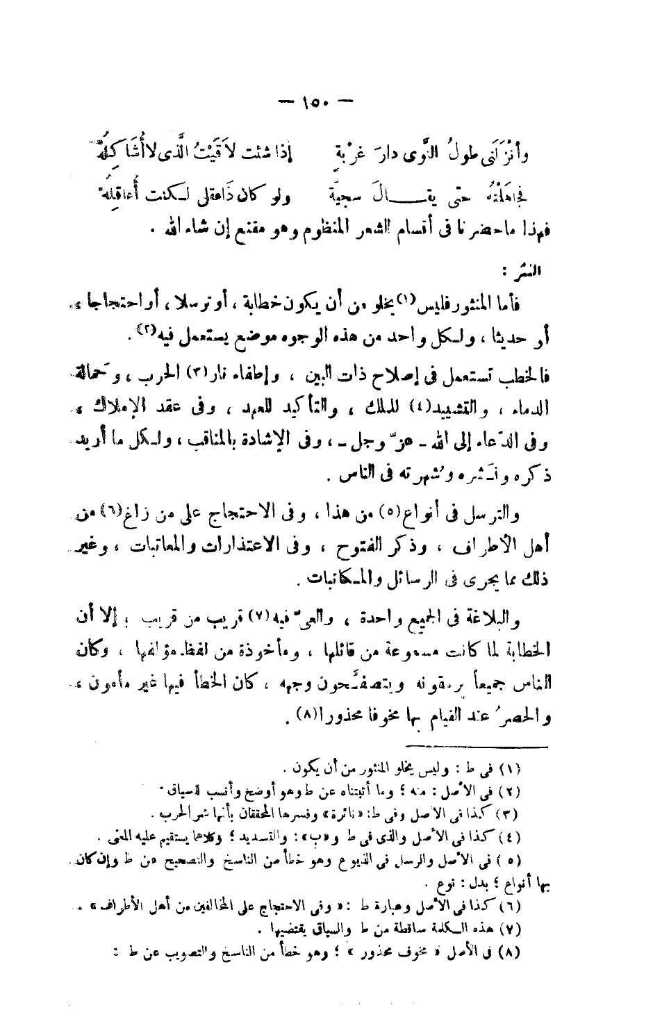 فأما المنثور فليس يخلو من أن يكون خطابة، أو ترسلا، أو احتجاجاً، أو حديثاً، ولكل واحد من هذه الوجوه موضع يستعمل فيه.