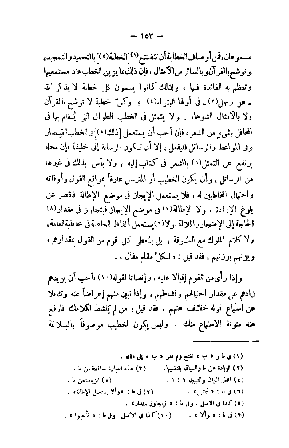 مسموعان، فمن أوصاف الخطابة أن تفتتح [الخطبة] بالتحميد والتمجيد، وتوشح بالقرآن وبالسائر من الأمثال، فإن ذلك مما يزين الخطب عند مستمعيها وتعظم به الفائدة فيها، ولذلك كانوا يسمون كل خطبة لا يذكر الله -عز وجل - في اولها البتراء؛ وكل خطبة لا توشح بالقرآن ولا بالأمثال الشوهاء. ولا يتمثل في الخطب الطوال التي يقام بها في المحافل بشيء من الشعر، فإن أحب أن يستعمل [ذلك] في الخطب القصار وفي المواعظ والرسائل فليفعل، إلا أن تكون الرسالة إلى خليفة فإن محله يرتفع عن التمثل بالشعر في كتاب إليه، ولا باس بذلك في غيرها من الرسائل، وأن يكون الخطيب أو المترسل عارفاً بمواقع القول وأوقاته واحتمال المخاطبين له، فلا يستعمل الإيجاز في موضع الإطالة فيقصر عن بلوغ الإرادة، ولا الإطالة في موضع الإيجاز فيتجاوز في مقدار الحاجة إلى الإضجار والملالة، ولا يستعمل ألفاظ الخاصة في مخاطبة العامة، ولا كلام الملوك مع السوقة، بل يعطي كل قوم من القول بمقدارهم، ويزنهم بوزنهم، فقد قيل: "لكل مقام مقال".