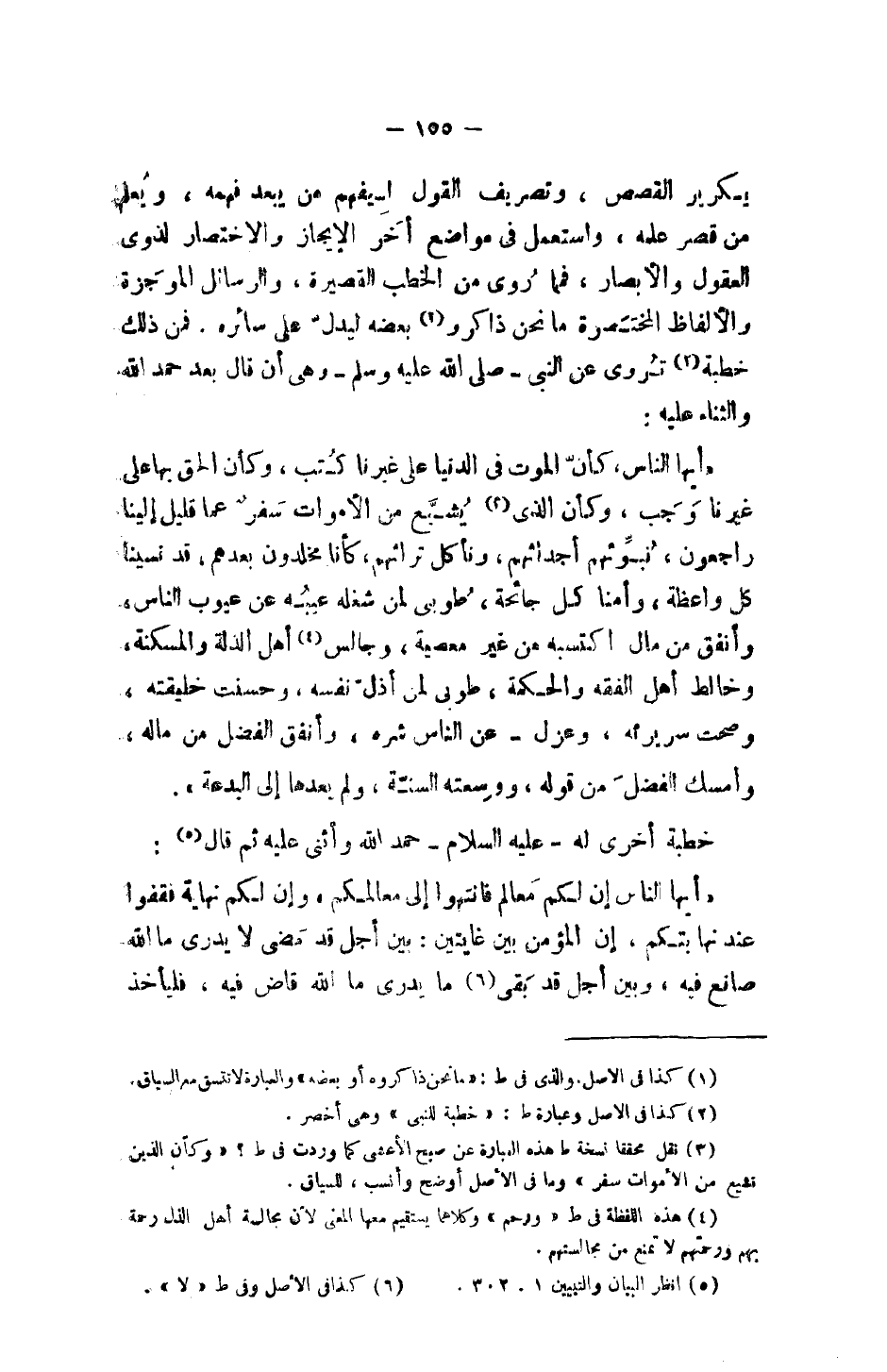 تكرير القصص، وتصريف القول ليفهم من يبعد فهمه، ويعلم من قصر علمه، واستعمل في مواضع أخر الإيجاز والاختصار لذوي العقول والأبصار، فما روي من الخطب القصيرة، والرسائل الموجزة والألفاظ المختصرة وما نحن ذاكرو بعضه ليدل على سائره. فمن ذلك خطبة تروى عن النبي - صلى الله عليه وسلم - وهي أن قال بعد حمد الله والثناء عليه: