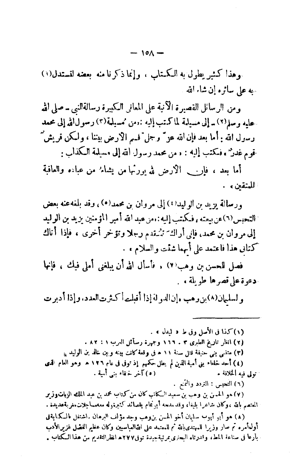 ومن الرسائل القصيرة الآتية على المعاني الكبيرة رسالة النبي - صلى الله عليه وسلم - إلى مسيلمة لما كتب إليه: "من مسيلمة رسول الله إلى محمد رسول الله: أما بعد فإن الله عز وجل قسم الأرض بيننا، ولكن قريش قوم غدر" فكتب إليه: "من محمد رسول الله إلى مسيلمة الكذاب: أما بعد، فإن الأرض لله يورثها من يشاء من عباده والعاقبة للمتقين".