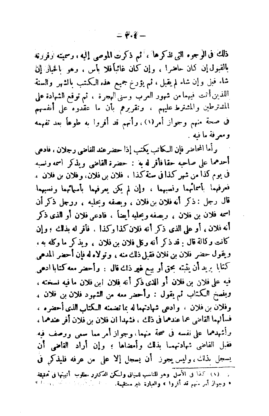 وأما المحاضر فإن الكاتب يكتب إذا حضر عند القاضي رجلان، فادعى أحدهما على صاحبه حقاً فأقر له به: حضرة القاضي ويذكر اسمه ونسبه في ويم كذا من شهر كذا في سنة كذا، فلان بن فلان، وفلان بن فلان، فعرفهما بأسمائهما ونسبهما، وإن لم يكن يعرفهما بأسمائهما ونسبهما قال رجل: ذكر أنه فلان بن فلان، ويصفه ويحليه، ورجل ذكر أن اسمه فلان بن فلان، ويصفه ويحليه أيضاً، فادعى فلان أو الذي ذكر أنه فلان، أو على الذي ذكر أنه فلان كذا وكذا، فأقر له بذلك؛ وإن كانت وكالة قال: قد ذكر أنه وكل فلان بن فلان، ويذكر ما وكله به، ويقول حضر فلان بن فلان فقبل ذلك منه، وتولاه له فإن أحضر المدعي كتاباً يريد أن يثبته بحق أو يبيع غير ذلك قال: وأحضر معه كتاباً ادعى فيه على فلان بن فلان أو الذي ذكر أنه فلان بن فلان ما فيه نسخته، وينسخ الكتاب ثم يقول: وأحضر معه من الشهود فلان بن فلان، وفلان بن فلان، وادعى شهادتهما قبل تضمنه الكتاب الذي أحضره، فسألهما القاضي عما عندهما، وأشهدهما على نفسه في صحة منهما، وجواز أمر مما سمى ووصف فيه فقيل القاضي شهادتهما بذلك وأمضاها؛ وإن أراد القاضي أن يسجل بذلك، وليس يجوز أن يسجل إلا على من عرفه فليذكر في