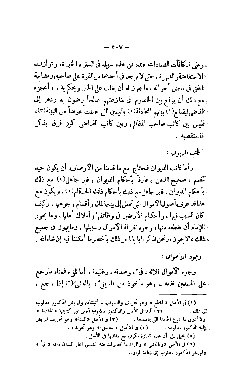 وأما كاتب الديوان فيحتاج مع ما قدمنا من الأوصاف أن يكون جيد الفهم، صحيح الذهن، عارفاً بأحكام الديوان، غير جاهل مع ذلك بأحكام الديوان، غير جاهل مع ذلك بأحكام ذلك الحكام، ويكون مع هذا قد عرف أصول الأموال التي تحمل إلى بيت المال وأقسام وجوهها، وكيف كان السبب فيها، وأحكام الأرضين في وظائفها وأملاك أهلها، وما يجوز للإمام أن يقطعه منها ووجه تفرقة الأموال وسبيلها، وما يجوز في جميع ذلك مما لا يجوز، ونحن نذكر باباً باباً من ذلك بأخصر ما أمكننا فيه إن شاء الله.