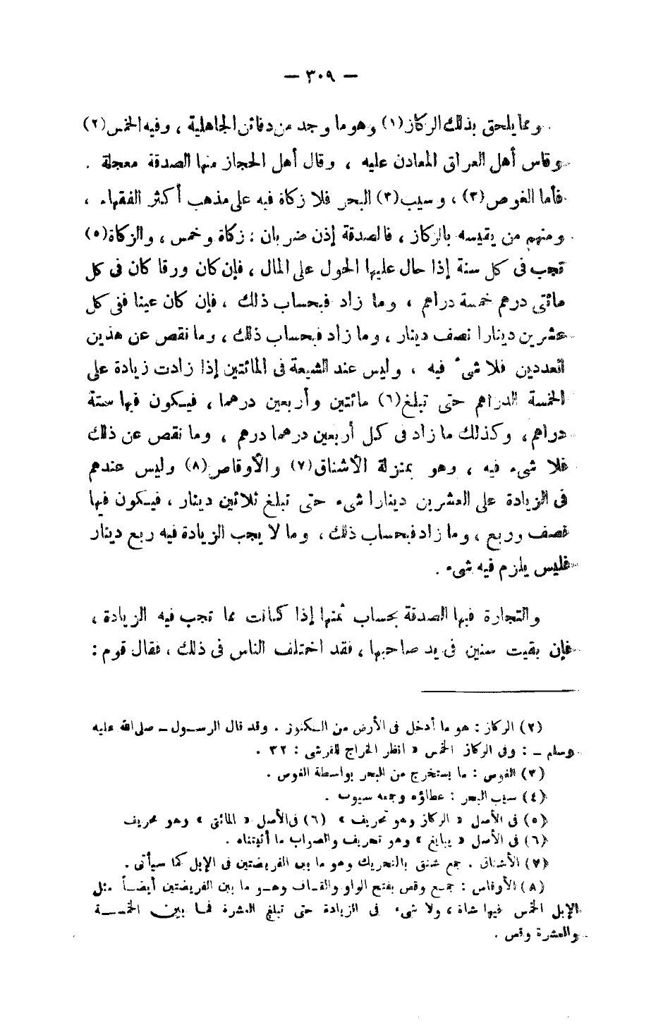 ومما يلحق بذلك الركاز وهو ما وجد من دفائن الجاهلية، وفيه الخمس وقاس أهل العراق المعادن عليه، وقال أهل الحجاز منها الصدقة معجلة. فأما الغوص، وسيب البحر فلا زكاة فيه على مذهب أكثر الفقهاء، ومنهم من يقيسه بالركاز، فالصدقة إذن ضربان: زكاة وخمس، والزكاة تجب في كل سنة إذا حال عليها الحول على المال، فإن كان ورقاً كان في كل مائتي درهم خمسة دراهم، وما زاد فبحساب ذلك، فإن كان عيناً ففي كل عشرين ديناراً نصف دينار، وما زاد فبحساب ذلك، وما نقص عن هذين العددين فلا شيء فيه، وليس عند الشيعة في المائتين إذا زادت زيادة على الخمسة الدراهم حتى تبلغ مائتين وأربعين درهماً، فيكون فيها ستة دراهم، وكذلك ما زاد في كل أربعين درهماً درهم، وما نقص عن ذلك فلا شيء فيه، وهو بمنزلة الأشناق والأوقاص وليس عندهم في الزيادة في العشرين ديناراً شيء حتى تبلغ ثلاثين دينار، فيكون فيها نصف وربع، وما زاد فبحساب ذلك، وما لا يجب الزيادة فيه ربع دينار فليس يلزم فيه شيء.