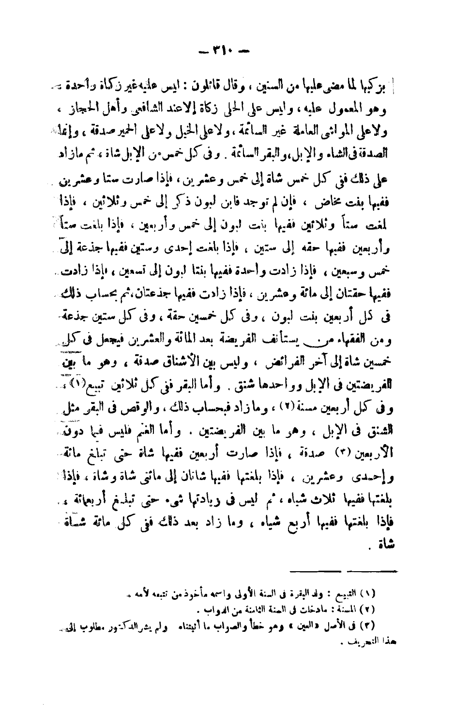 يزكيها لما مضى عليها من السنين، وقال قائلون: ليس عليه غير زكاة واحدة وهي المعمول عليه، وليس على الحلي زكاة إلا عند الشافعي وأهل الحجاز، ولا على المواشي العاملة غير السائمة، ولا على الخيل ولا على الحمير صدقة، وإنما الصدقة في الشاء والإبل، والبقر السائمة. وفي كل خمس من الإبل شاة، ثم ما زاد على ذلك ففي كل خمس شاة إلى خمس وعشرين، فإذا صارت ستاً وعشرين ففيها بنت مخاض، فإن لم توجد فابن لبون ذكر إلى خمس وثلاثين، فإذا بلغت ستاً وثلاثين ففيها بنت لبون إلى خمس وأربعين، فإذا بلغت ستاً وأربعين ففيها حقه إلى ستين، فإذا بلغت إحدى وستين ففيها جذعة إلى خمس وسبعين، فإذا زادت واحدة ففيها بنتاً لبون إلى تسعين، فإذا زادت ففيها حقتان إلى مائة وعشرين، فإذا زادت ففيها جذعتان، ثم بحساب ذلك في كل أربعين بنت لبون، وفي كل خمسين حقة، وفي كل ستين جذعة ومن الفقهاء من يستأنف الفريضة بعد المائة والعشرين فيجعل في كل خمسين شاة إلى آخر الفرائض، وليس بين الأشناق صدقة، وهو ما بين الفريضتين في الإبل وواحدها شنق. وأما البقر ففي كل ثلاثين تبيع، وفي كل أربعين مسنة، وما زاد فبحساب ذلك، والوقص في البقر مثل الشنق في الإبل، وهو ما بين الفريضتين. وأما الغم فليس فيما دون الأربعين صدقة، فإذا صارت أربعين ففيها شاة حتى تبلغ مائة وإحدى وعشرين، فإذا بلغتها ففيها شاتان إلى مائتي شاة وشاة، فإذا بلغتها ففيها ثلاث شياه، ثم ليس في زيادتها شيء حتى تبلغ أربعمائة، فإذا بلغتها ففيها أربع شياه، وما زاد بعد ذلك ففي كل مائة شاة شاة.