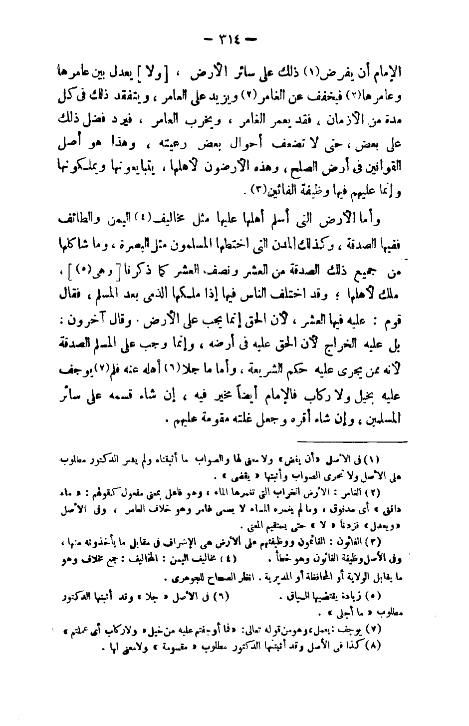 الإمام أن يفرض ذلك على سائر الأرض، [ولا] يعدل بين عامرها وغامرها فيخفف عن الغامر ويزيد على العامر، ويتفقد ذلك في كل مدة من الأزمان، فقد يعمر الغامر، ويخرب العامر، فيرد فضل ذلك على بعض، حتى لا تضعف أحوال بعض رعيته، وهذا هو أصل القوانين في أرض الصلح، وهذه الأرضون لأهلها، يتبايعونها ويملكونها وإنما عليهم فيها وظيفة الفائين.