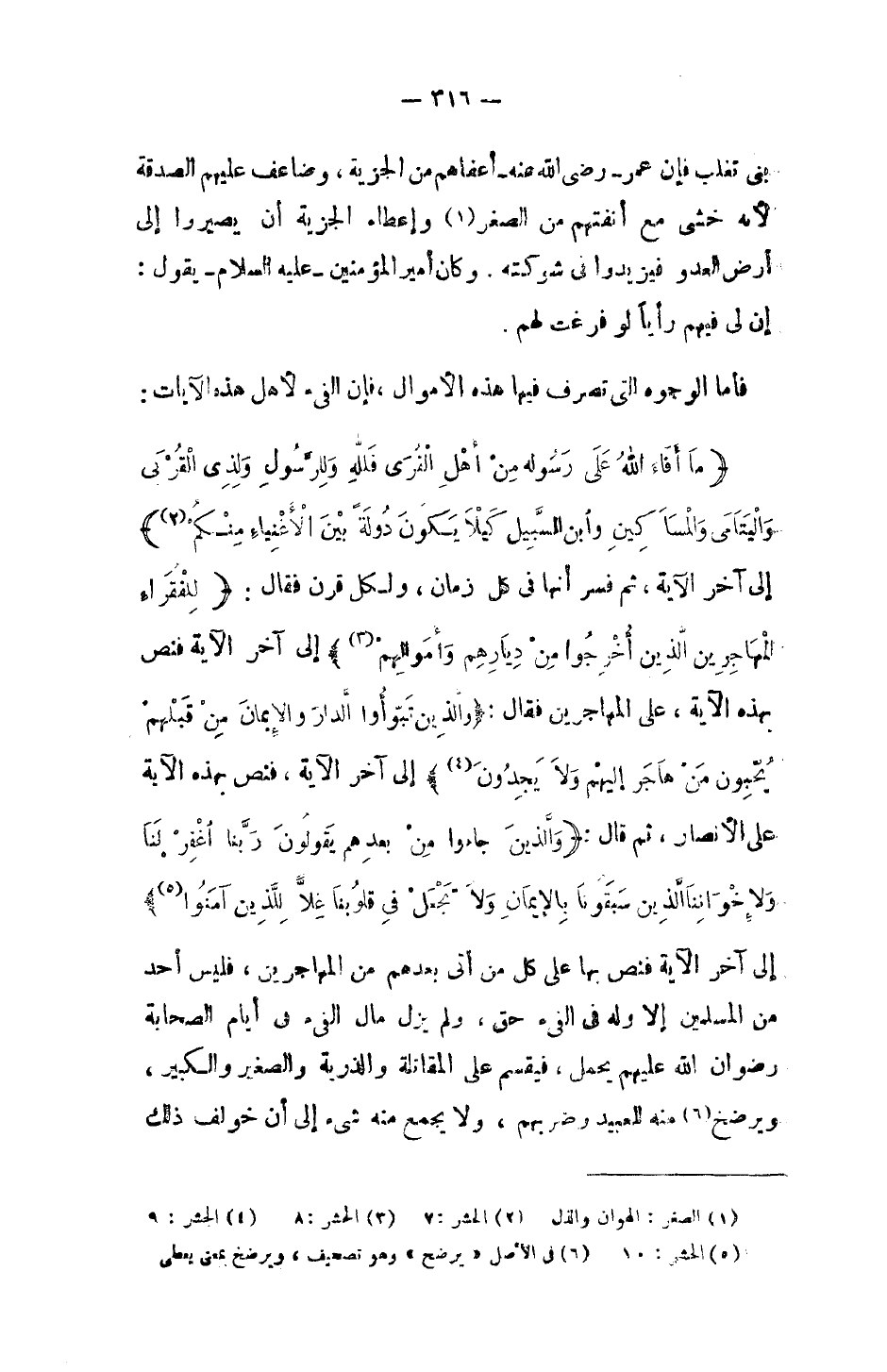 بني تغلب فإن عمر - رضي الله عنه - أعفاهم من الجزية، وضاعف عليهم الصدقة لأنه خشي مع أنفتهم من الصغر وإعطاء الجزية أن يصيروا إلى أرض العدو فيزيدوا في شوكته. وكان أمير المؤمنين - عليه السلام - يقول: إن في فيهم رأياً لو فرغت لهم.