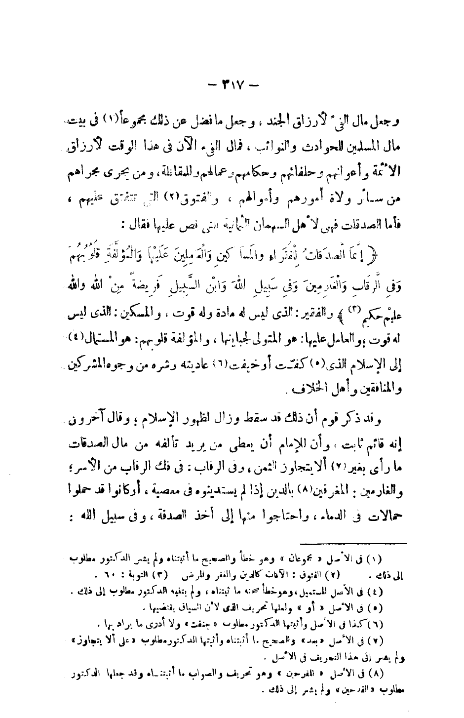 وجعل مال الفيء لأرزاق الجند، وجعل ما فضل عن ذلك مجموعاً في بيت مال المسلمين للحوادث والنوائب، فمال الفيء الآن في هذا الوقت لأرزاق الأئمة وأعوانهم وحلفائهم وحكامهم وعمالهم وللمقاتلة، ومن يجري مجراهم من سائر ولاة أمورهم وأموالهم، والفتوق التي تتفتق عنهم، فأما الصدقات فهي لأهل السهمان الثمانية التي نص عليها فقال: {إِنَّمَا الصَّدَقَاتُ لِلْفُقَرَاءِ وَالْمَسَاكِينِ وَالْعَامِلِينَ عَلَيْهَا وَالْمُؤَلَّفَةِ قُلُوبُهُمْ وَفِي الرِّقَابِ وَالْغَارِمِينَ وَفِي سَبِيلِ اللَّهِ وَاِبْنِ السَّبِيلِ فَرِيضَةً مِنَ اللَّهِ وَاللَّهُ عَلِيمٌ حَكِيمٌ} والفقير: الذي ليس له مادة وله قوت، والمسكين: الذي ليس له قوت؛ والعامل عليها: هو المتولي لجبايتها، والمؤلفة قلوبهم: هو المستمال إلى الإسلام الذي كفت أو خفيت عاديته وشره من وجوه المشركين والمنافقين وأهل الخلاف.