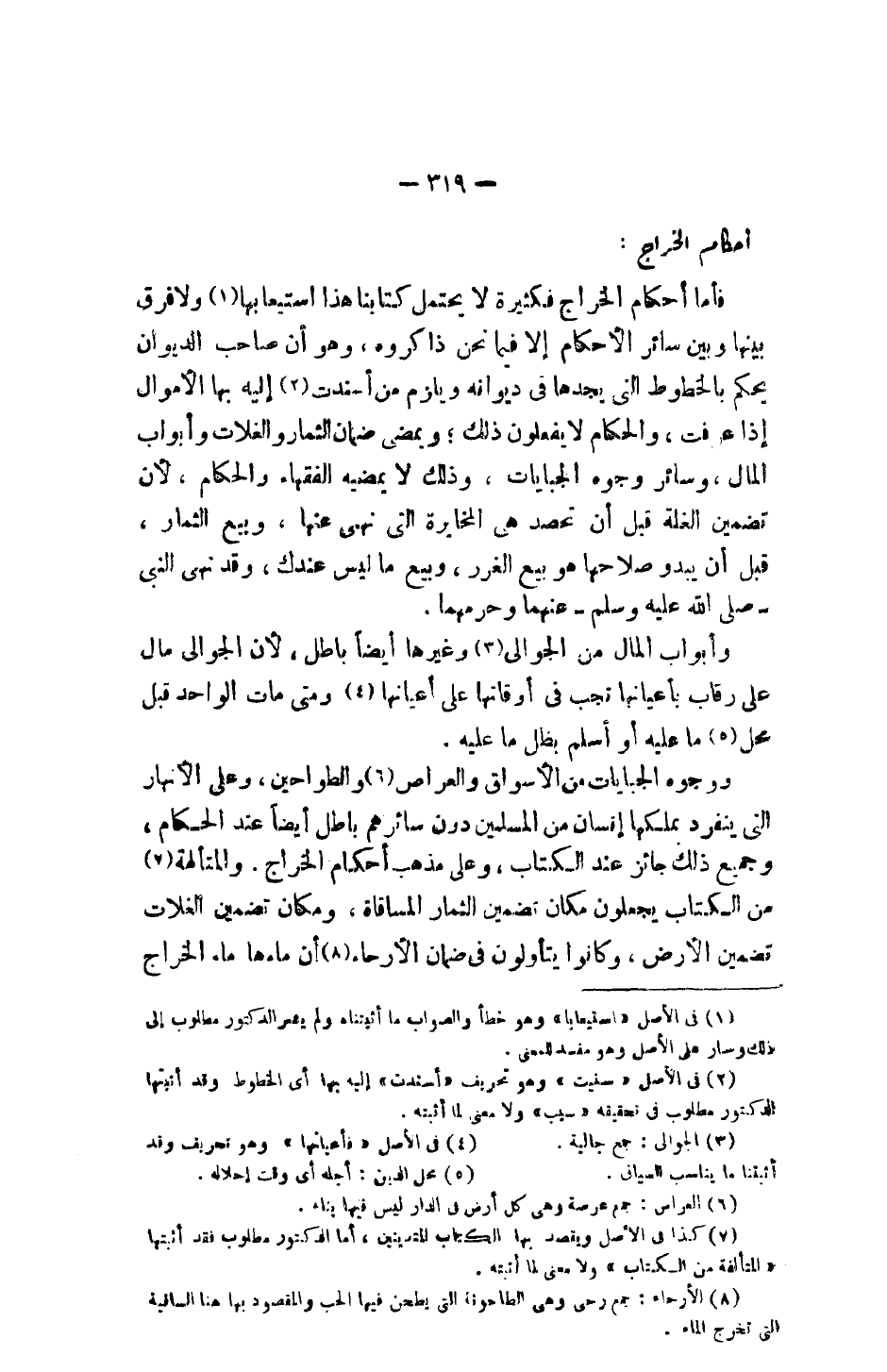ووجوه الجبايات من الأسواق والعراص والطواحين، وعلى الأنهار التي ينفرد بملكها إنسان من المسلمين دون سائرهم باطل أيضاً عند الحكام، وجميع ذلك جائز عند الكتاب، وعلى مذهب أحكام الخراج، والمتألهة من الكتاب يجلعون مكان تضمين الثمار المساقاة، ومكان تضمين الغلات تضمين الأرض، وكانوا يتأولون في ضمان الأرحاء أن ماءها ماء الخراج