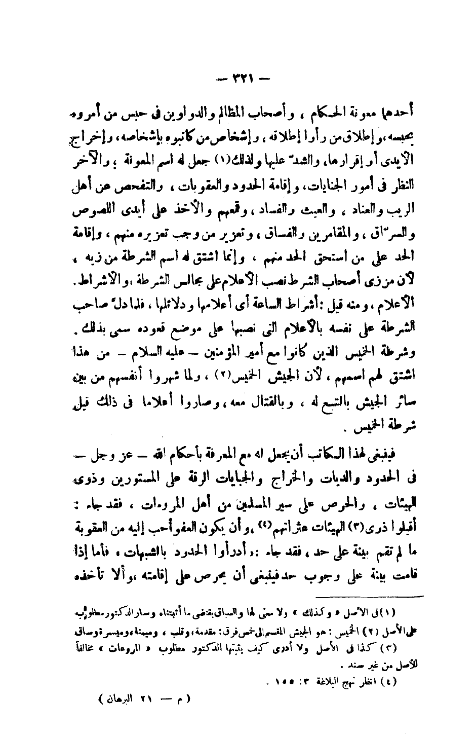 أحدهم معونة الحكام، وأصحاب المظالم والدواوين في حبس من أمروه بحبسه، وإطلاق من رأوا إطلاقه، وإشخاص من كاتبوه بإشخاصه، إخراج الأيدي أو إقرارها، والشد عليها ولذلك جعل له اسم المعونة؛ والآخر النظر في أمور الجنايات، وإقامة الحدود والعقوبات، والتفحص عن أهل الريب والعناد، والعبث والفساد، وقمعهم والأخذ على أيدي اللصوص والسرّاق، والمقامرين والفساق، وتعزيز من وجب تعزيزه منهم، وإقامة الحد على من استحق الحد منهم، وإنما اشتق له اسم الشرطة من زيه، لأن من زي أصحاب الشرطة نصب الأعلام على مجالس الشرطة، والأشرطة. الأعلام، ومنه قيل: أشراط الساعة أي أعلامها ودلائلها، فلما دل صاحب الشرطة على نفسه بالأعلام التي نصبها على موضع قعوده سمي بذلك. وشرطة الخميس الذين كانوا مع أمير المؤمنين - عليه السلام - من هذا اشتق لهم اسمهم، لأن الجيش الخميس، ولما شهروا أنفسهم من بين سائر الجيش بالتبع له، وبالقتال معه، وصاروا أعلاماً في ذلك قيل شرطة الخميس.