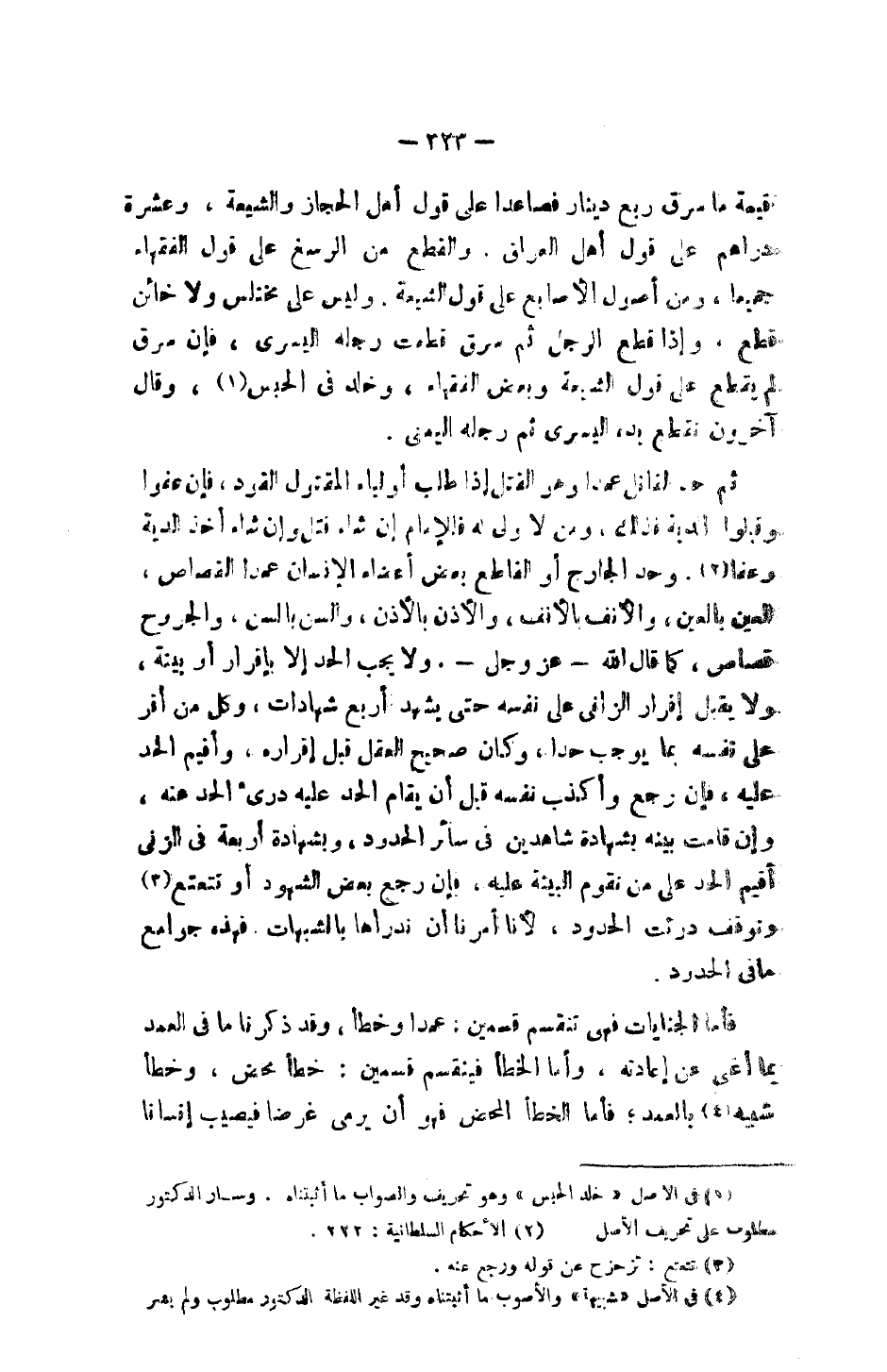 ثم حد القاتل عمداً وهو القتل إذا طلب أولياء المقتول القود، فإن عفوا وقبلوا الدية فذلك، ومن لا ولي له فللإمام إن شاء قتل وإن شاء أخذ الدية وعفا. وحد الجارح أو القاطع بعض أعضاء الإنسان عمداً القصاص، العين بالعين، والأنف بالأنف، والأذن بالأذن، والسن بالسن، والجروح قصاص، كما قالله الله - عز وجل -. ولا يجب الحد إلا بإقرار أو بينة، ولا يقبل إقرار الزاني على نفسه حتى يشهد أربع شهادات، وكل من أقر على نفسه بما يوجب حداً، وكان صحيح العقل قبل إقراره، وأقيم الحد عليه، فإن رجع وأكذب نفسه قبل أن يقام الحد عليه درئ الحد عنه، وإن قامت بينة بشهادة شاهدين في سائر الحدود، وبشهادة أربعة في الزنى أقيم الحد على من تقوم البينة عليه، فإن رجع بعض الشهود أو تتعتع وتوقف درئت الحدود، لأنا أمرنا أن ندرأها بالشبهات، فهذه جوامع ما في الحدود.