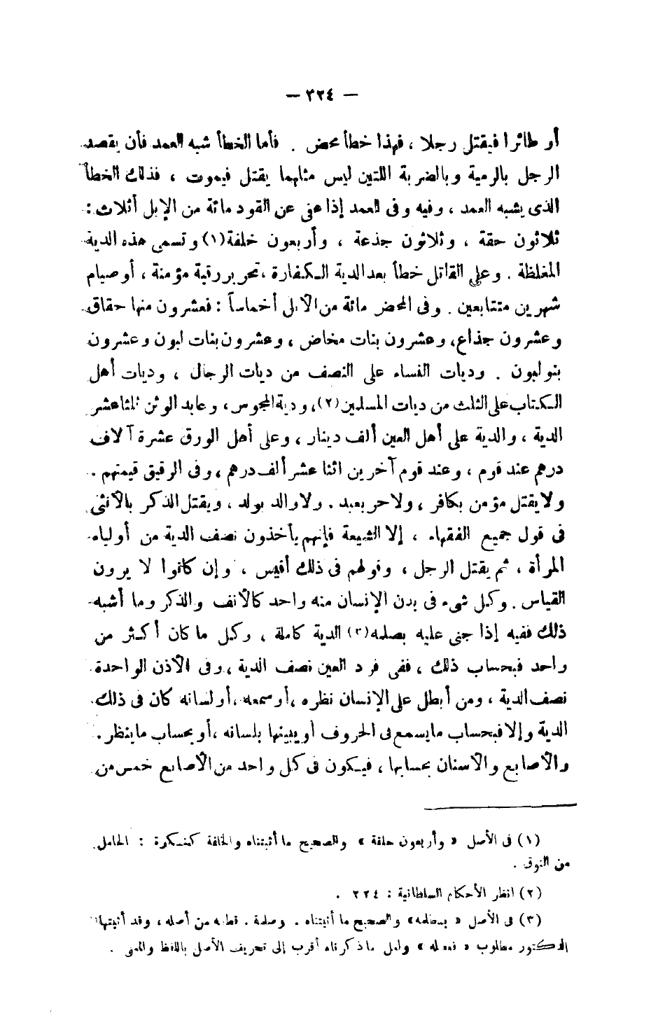 أو طائراً فيقتل رجلاً، فهذا خطأ محض. فأما الخطأ شبه العمد فأن يقصد الرجل بالرمية وبالضربة اللتين ليس مثلهما يقتل فيموت، فذلك الخطأ الذي يشبه العمد، وفيه وفي العمد إذا عفي عن القود مائة من الإبل أثلاث: ثلاثون حقه، وثلاثون جذعة، وأربعون خلفة وتسمى هذه الدية المغلظة. وعلى القاتل خطأ بعد الدية الكفاءة، تحرير رقبة مؤمنة، أو صيام شهرين متتابعين. وفي المحض مائة من الإبل أخماساً: فعشرون منها حقاق وعشرون جذاع، وعشرون بنات مخاض، وعشرون بنات لبون وعشرون بنو لبون. وديات النساء على النصف من ديات الرجال، وديات أهل الكتاب على الثلث من ديات المسلمين، ودية المجوس، وعابد الوثن ثلثا عشر الدية، والدية على أهل العين ألف دينار، وعلى أهل الورق عشرة آلاف درهم عند قوم، وعند قوم آخرين اثنا عشر ألف درهم، وفي الرقيق قيمتهم. ولا يقتل مؤمن بكافر، ولا حر بعبد، ولا والد بولد، ويقتل الذكر بالأنثى في قول جميع الفقهاء، إلا الشيعة فإنهم يأخذون نصف الدية من أولياء المرأة، ثم يقتل الرجل، وقولهم في ذلك أقيس، وإن كانوا لا يلون القياس. وكل شيء في بدن الإنسان منه واحد كالأنف والذكر وما أشبه ذلك ففيه إذا جنى عليه بصلمه الدية كاملة، وكل ما كان أكثر من واحد فبحساب ذلك، ففي فرد العين نصف الدية، وفي الأذن الواحدة نصف الدية، ومن أبطل على الإنسان نظره، أو سمعه، أو لسانه كان في ذلك الدية وإلا فبحساب ما يسمع في الحروف أو يبينها بلسانه، أو بحساب ما ينظر. والأصابع والأسنان بحسابها، فيكون في كل واحد من الأصابع خمس من