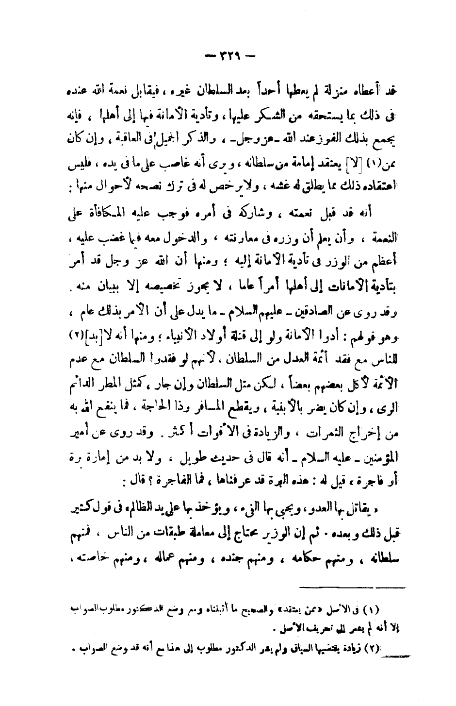 أنه قد قبل نعمته، وشاركه في أمره فوجب عليه المكافأة على النعمة، وأن يعلم أن وزره في معاونته، والدخول معه فيما غضب عليه، أعظم من الوزر في تأدية الأمانة إليه؛ ومنها أن الله عز وجل قد أمر بتأدية الأمانات إلى أهلها أمراً عاماً، لا يجوز تخصيصه إلا ببيان منه. وقد روي عن الصادقين - عليهم السلام - ما يدل على أن الأمر بذلك عام، وهو قولهم: أدوا الأمانة ولو إلى قتلة أولاد الأنبياء؛ ومنها أنه لا بد للناس مع فقد أئمة العدل من السلطان، لأنهم لو فقدوا السلطان مع عدم الأئمة لأكل بعضهم بعضاً، لكن مثل السلطان وإن جار، كمثل المطر الدائم الري، وإن كان يضر بالأبنية، ويقطع المسافر وذا الحاجة، فما ينفع الله به من إخراج الثمرات، والزيادة في الأقوات أكثر. وقد روي عن أمير المؤمنين - عليه السلام - أنه قال في حديث طويل، ولابد من إمارة برة أو فاجرة"، قيل له: هذه البرة قد عرفناها، فما الفاجرة؟ قال: "يقال بها العدو، ويجبى بها الفيء، ويؤخذ بها على يد الظالم" في قول كثير قبل ذلك وبعده. ثم إن الوزير محتاج إلى معاملة طبقات من الناس، فمنهم سلطانه، ومنهم حكامه، ومنهم جنده، ومنهم عماله، ومنهم خاصته،