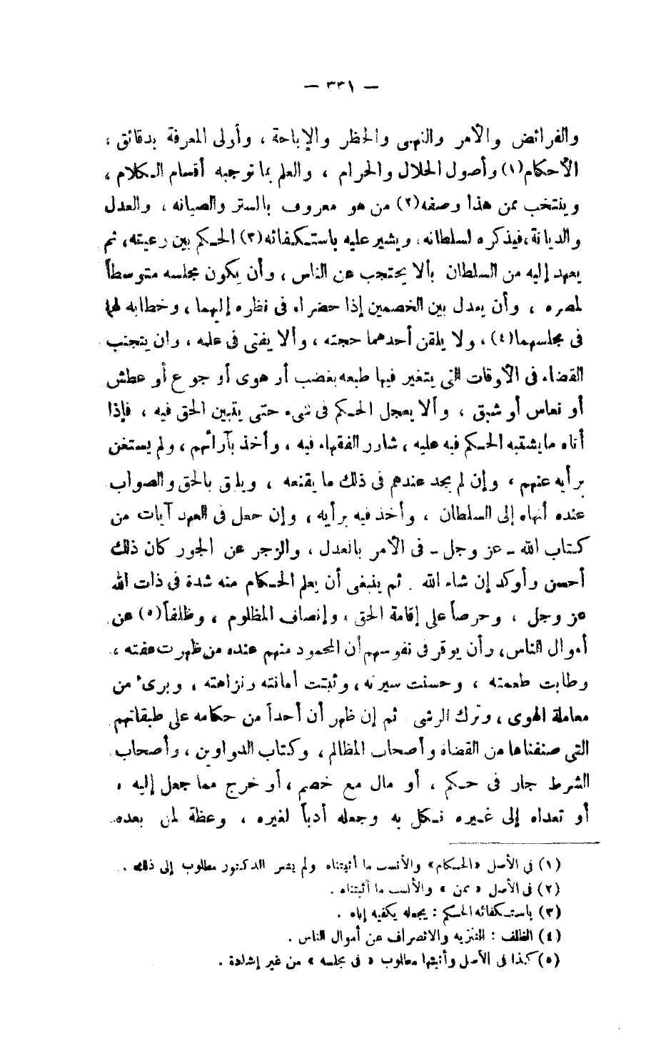 والفرائض والأمر والنهي والحظر والإباحة، وأولى المعرفة بدقائق الأحكام وأصول الحلال ولا حرام، والعلم بما توجبه أقسام الكلام، وينتخب ممن هذا وصفه من هو معروف بالستر والصيانة، والعدل والديانة، فيذكره لسلطانه، ويشير عليه باستكفائه الحكم بين رعيته، ثم يعهد إليه من السلطان بألا يحتج عن الناس، وأن يكون مجلسه متوسطاً لمصره، وأن يعدل بين الخصمين إذا حضراه في نظره إليهما، وخطابه لهما في مجلسهما، ولا يقلقن أحدهما حجته، وألا يفتى في علمه، وأن يتجنب القضاء في الأوقات التي يتغير فيها طبعه بغضب أو هوى أو جوع أو عطش أو نعاس أو شبق، وألا يعجل الحكم في الشيء حتى يتبين الحق فيه، فإذا أتاه ما يتشبه الحكم فيه عليه، شاور الفقهاء فيه، وأخذ بآرائهم، ولم يستغن برأيه عنهم، وإن لم يجد عندهم في ذلك ما يقنعه، ويليق بالحق والصواب عنده أنهاه إلى السلطان، وأخذ فيه برأيه، وإن جعل في العهد آيات من كتاب الله - عز وجل - في الأمر بالعدل، والزجر عن الجور كان ذلك أحسن وأوكد إن شاء الله. ثم ينبغي أن يعلم الحكام منه شدة في ذات الله عز وجل، وحرصاً على إقامة الحق، وإنصاف المظلوم، وظلفاً عن أموال الناس، وأن يوقر في نفوسهم أن المحمود منهم عنده من ظهرت عفته، وطابت طعمته، وحسنت سيرته، وثبتت أمانته ونزاهته، وبرئ من معاملة الهوى، وترك الرشى ثم إن ظهر أن أحداً من حكامه على طبقاتهم التي صنفناها من القضاء وأصحاب المظالم، وكتاب الدواوين، وأصحاب الشرط جار حكم، أو مال مع خصم، أو خرج مما جعل إليه، أو تعداه إلى غيره نكل به وجعله أدباً لغيره، وعظة لمن بعده