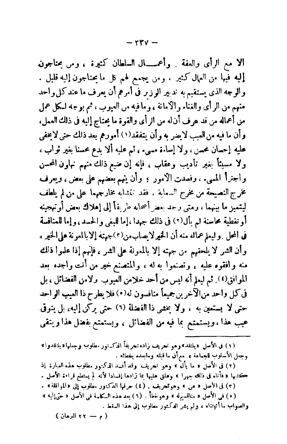 إلا مع الرأي والعفة. وأعمال السلطان كثيرة، ومن يحتاجون إليه فيها من العمال كثير، ومن يجمع لهم كل ما يحتاجون إليه قليل. والوجه الذي يستقيم به تدبير الوزير في أمرهم أن يعرف ما عند كل واحد منهم من الرأي والغناء والأمانة، وما فيه من العيوب، ثم بوجه لكل عمل من أعماله من قد عرف أن له من الرأي والقوة ما يحتاج إليه في ذلك العمل، وأن ما فيه من العيب لا يضر به وأن يتفقد أمورهم بعد ذلك حتى لا يخفى عليه إحسان محسن، ولا إساءة مسيء، ثم عليه ألا يدع محسناً بغير وثاب، ولا مسيئاً بغير تأديب وعقاب، فإنه إن ضيع ذلك منهم تهاون المحسن واجترأ المسيء، وفسدت الأمور؛ وأن يتهم بعضهم على بعض، ويعرف مخرج النصيحة من مخرج السعاية، فقد تتشابه مخارجها على من لم يلطف ليتميز ما بينهما، ومتى وجد بعض أصحابه طريقاً إلى إهلاك بعض أو تهجينه أو تغطية محاسنه لم يأل في ذلك جهداً، إما للبغي والحسد، وإما للمنافسة في المحل، وليعلم عماله منه أن الخير لا يصاب من جهته إلا بالمعونة على الخير، وأن الشر لا يلحقهم من جهته إلا بالمعونة على الشر، فإنهم إذا علموا ذلك منه وافقوه عليه، وتصنعوا به له، والمتصنع خير من أنت واجده بعد الموافق ثم ليعلم أنه ليس من أحد خلا من العيوب ولا من الفضائل، بل في كل واحد من الآخرين جميعاً منافسون له فلا يطرح ذا العيب الواحد حتى لا يستعين به، ولا يخشى ذا الفضلة حتى يركن إليه، بل يتوفى عيب هذا، ويستمتع بما فيه من الفضائل، ويستمتع بفضل هذا ويتقي