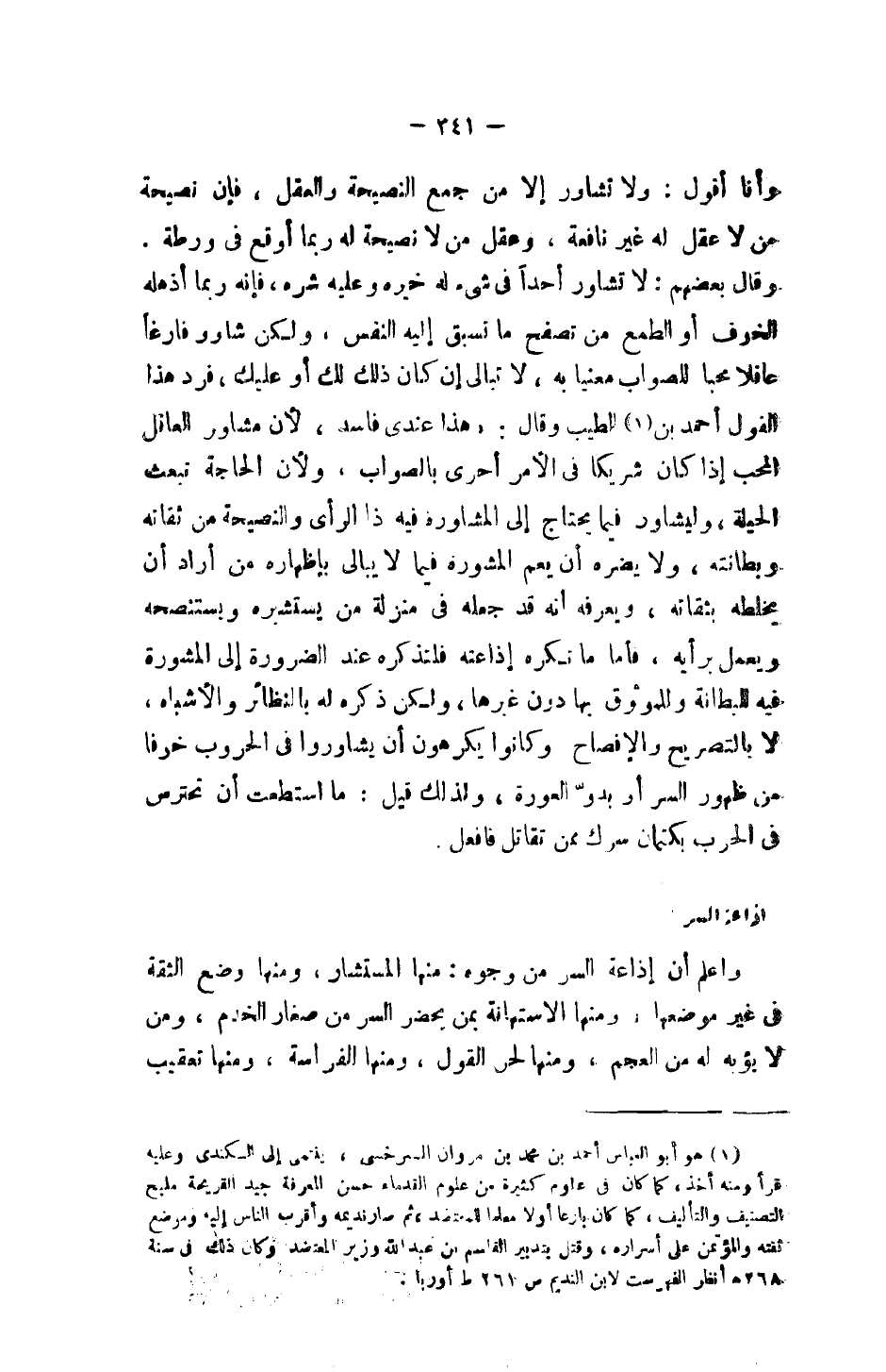 وأنا اقول: ولا تشاور إلا من جمع النصيحة والعقل، فإن نصيحة من لا عقل له غير نافعة، وعقل من لا نصيحة له ربما أوقع في ورطة. وقال بعضهم: لا تشاور أحداً في شيء له خيره وعيله شره، فإنه ربما أذهله الخوف أو الطمع من تصفح ما تسبق إليه النفس، ولكن شاور فارغاً عاقلاً محباً للصواب معنياً به، لا يبالي إن كان ذلك لك أو عليك، فرد هذا القول أحمد بن الطيب وقال: "هذا عندي فاسد، لأن مشاور العاقل المحب إذا كان شريكاً في الأمر أحرى بالصواب، ولأن الحاجة تبعث الحيلة، وليشاور فيما يحتاج إلى المشاورة فيه ذا الرأي والنصيحة من ثقاته وبطانته، ولا يضره أن يعم المشورة فيما لا يبالي بإظهاره من أراد أن يخلطه بثقاته، ويعرفه أنه قد جعله في منزلة من يستشيره ويستنصحه ويعمل برأيه، فأما ما تكره إذاعته فالتذكره عند الضرورة إلى المشورة فيه للبطانة واللموثوق بها دون غيرها، ولكن ذكره له بالنظائر والأشباه، لا بالتصريح والإفصاح وكانوا يكرهون أن يشاوروا في الحروب خوفاً من ظهور السر أو بدو العورة، ولذلك قيل: ما استطعت أن نحترس في الحرب بكتمان سرك ممن تقاتل فافعل.