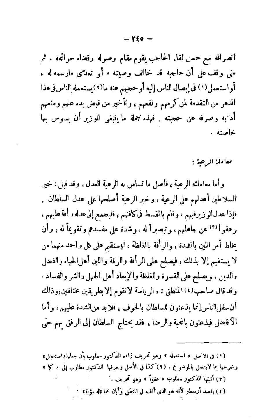 انصرافه مع حسن لقاء الحاجب يقوم مقام وصوله وقضاء حوائجه، ثم متى وقف على أن حاجبه قد خالف وصيته، أو تعدى ما رسمه له، أو استعمل في إيصال الناس إليه أو حجبهم عنه ما يستعمله الناس في هذا الدهر من التقدمة من كرمهم ونفعهم، وتأخير من قبض يده عنهم ومنعهم أدبه وصرفه عن حجبته. فهذه جملة ما ينبغي للوزير أن يسوس بها خاصته.