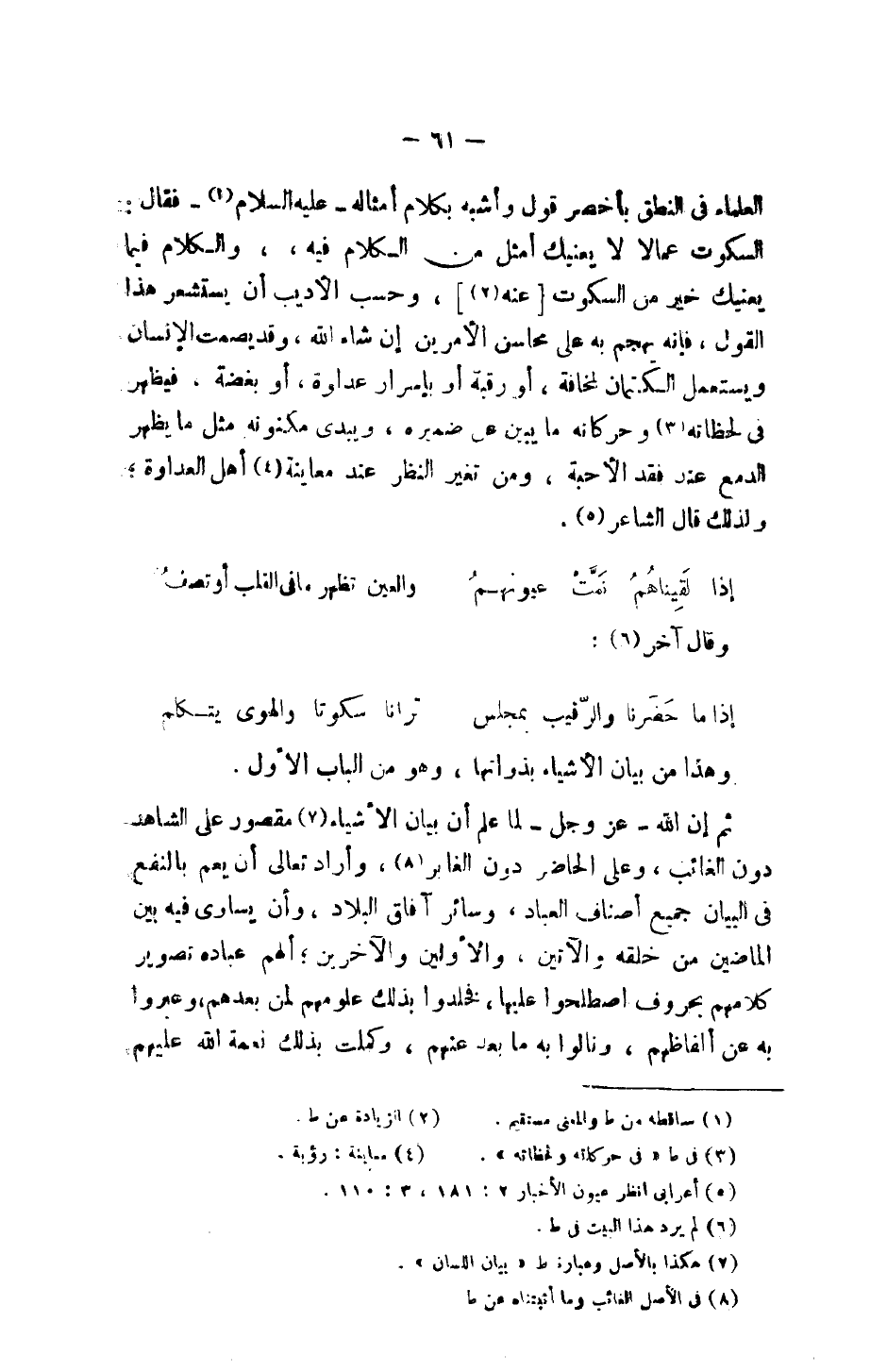العلماء في النطق بأخصر قول وأشبه بكلام أمثاله - عليه السلام - فقال: السكوت عمالا لا يعنيك أمثل من الكلام فيه، والكلام فيما يعنيك خير من السكوت [عنه]، وحسب الأديب أن يستشعر هذا القول، فإنه يهجم به على محاسن الأمرين إن شاء الله، وقد يصمت الإنسان ويستعمل الكتمان لمخافة، أو رقبة أو بإسرار عداوة، أو بغضة، فيظهر في لحظاته وحركاته ما يبين عن ضميره، ويبدى مكنونه مثل ما يظهر الدمع عند فقد الأحبة، ومن تغير النظر عند معاينة أهل العداوة، ولذلك قال الشاعر: