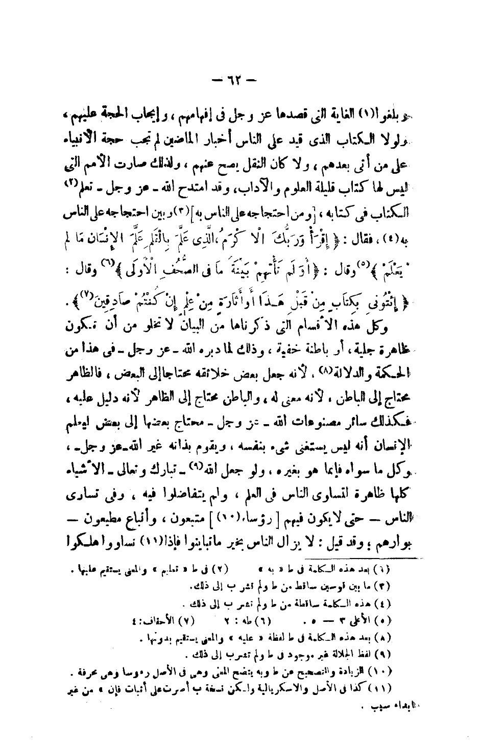 وبلغوا الغاية التي قصدها عز وجل في إفهامهم، وإيجاب الحجة عليهم، ولولا الكتاب الذي قيد على الناس أخبار الماضين لم تجب حجة الأنبياء على من أتى بعدهم، ولا كان النقل يصح عنهم، ولذلك صارت الأمم التي ليس لها كتاب قليلة العلوم والآداب، وقد امتدح الله - عز وجل - تعلم الكتاب في كتابه، [ومن احتجاجه على الناس به] وبين احتجاجه على الناس به، فقال: {اقْرَا بِاسْمِ رَبِّكَ الَّذِي خَلَقَ* خَلَقَ الإِنسَانَ مِنْ عَلَقٍ*اقْرَا وَرَبُّكَ الأَكْرَمُ* الَّذِي عَلَّمَ بِالْقَلَمِ* عَلَّمَ الإِنسَانَ مَا لَمْ يَعْلَمْ} وقال: {أَوَلَمْ تَاتِهِمْ بَيِّنَةُ مَا فِي الصُّحُفِ الأُولَى} وقال: {اِئْتُونِي بِكِتَابٍ مِنْ قَبْلِ هَذَا أَوْ أَثَارَةٍ مِنْ عِلْمٍ إِنْ كُنْتُمْ صَادِقِينَ}.