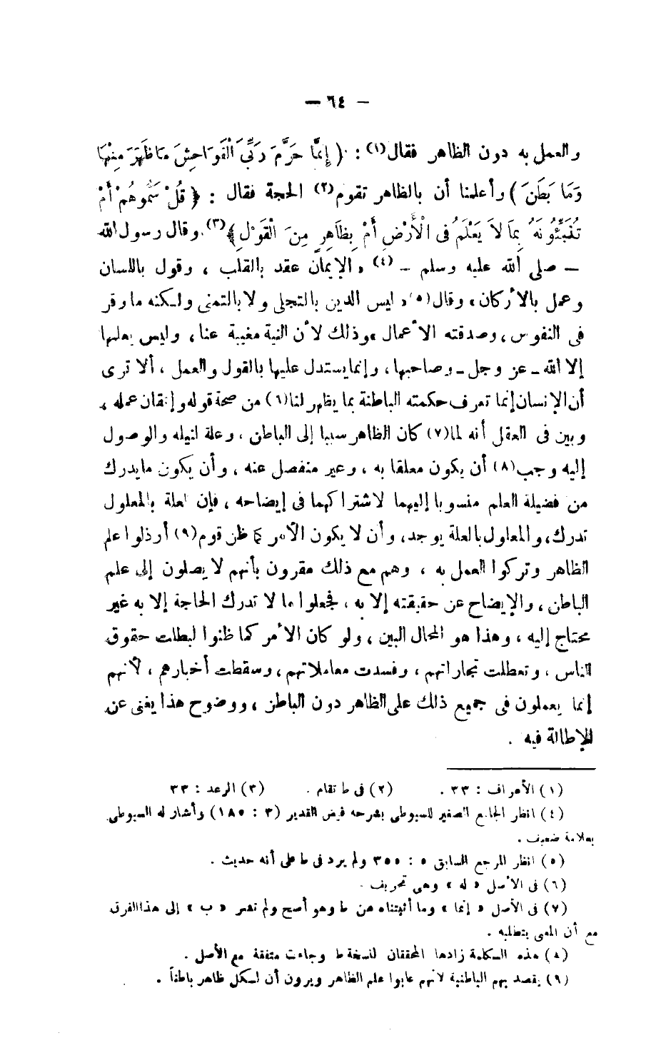 والعمل به دون الظاهر فقال: (إنما حرم ربي الفواحش ما ظهر منها وما بطن) وأعلمنا أن بالظاهر تقوم الحجة فقال: {قُلْ سَمُّوهُمْ أَمْ تُنَبِّئُونَهُ بِمَا لا يَعْلَمُ فِي الأَرْضِ أَمْ بِظَاهِرٍ مِنَ الْقَوْلِ}، وقال رسول الله - صلى الله عليه وسلم - "الإيمان عقد بالقلب، وقول باللسان وعمل بالأركان"، وقال "ليس الدين بالتجلي ولا بتمني ولكنه ما وقر في النفوس، وصدقته الأعمال" وذلك لأن النية مغيبة عنا، وليس يعلمها إلا الله - عز وجل - وصاحبها، وإنما يستدل عليها بالقول والعمل، ألا ترى أن الإنسان إنما تعرف حكمته الباطنة بما يظهر لنا من صحة قوله وإتقان عمله، وبين في العقل أنه لما كان الظاهر سبباً إلى الباطن، وعلة لنيله والوصول إليه وجب أن يكون معلقاً به، وغير منفصل عنه، وأن يكون ما يدرك من فضيلة العلم منسوباً إليهما لاشتراكهما في إيضاحه، فإن لعلة بالمعلول تدرك، والمعلول بالعلة يوجد، وأن لا يكون الأمر كما ظن قوم أرذلوا علم الظاهر وتركوا العمل به، وهم مع ذلك مقرون بأنه لا يصلون إلى علم الباطن، والإيضاح عن حقيقته إلا به، فجعلوا ما لا تدرك الحاجة إلا به غير محتاج إليه، وهذا هو المحال البين، ولو كان الأمر كما ظنوا لبطلت حقوق الناس، وتعطلت تجاراتهم، وفسدت معاملاتهم، وسقطت أخبارهم، لأنهم إنما يعملون في جميع ذلك على الظاهر دون الباطن، ووضوح هذا يغني عن الإطالة فيه.