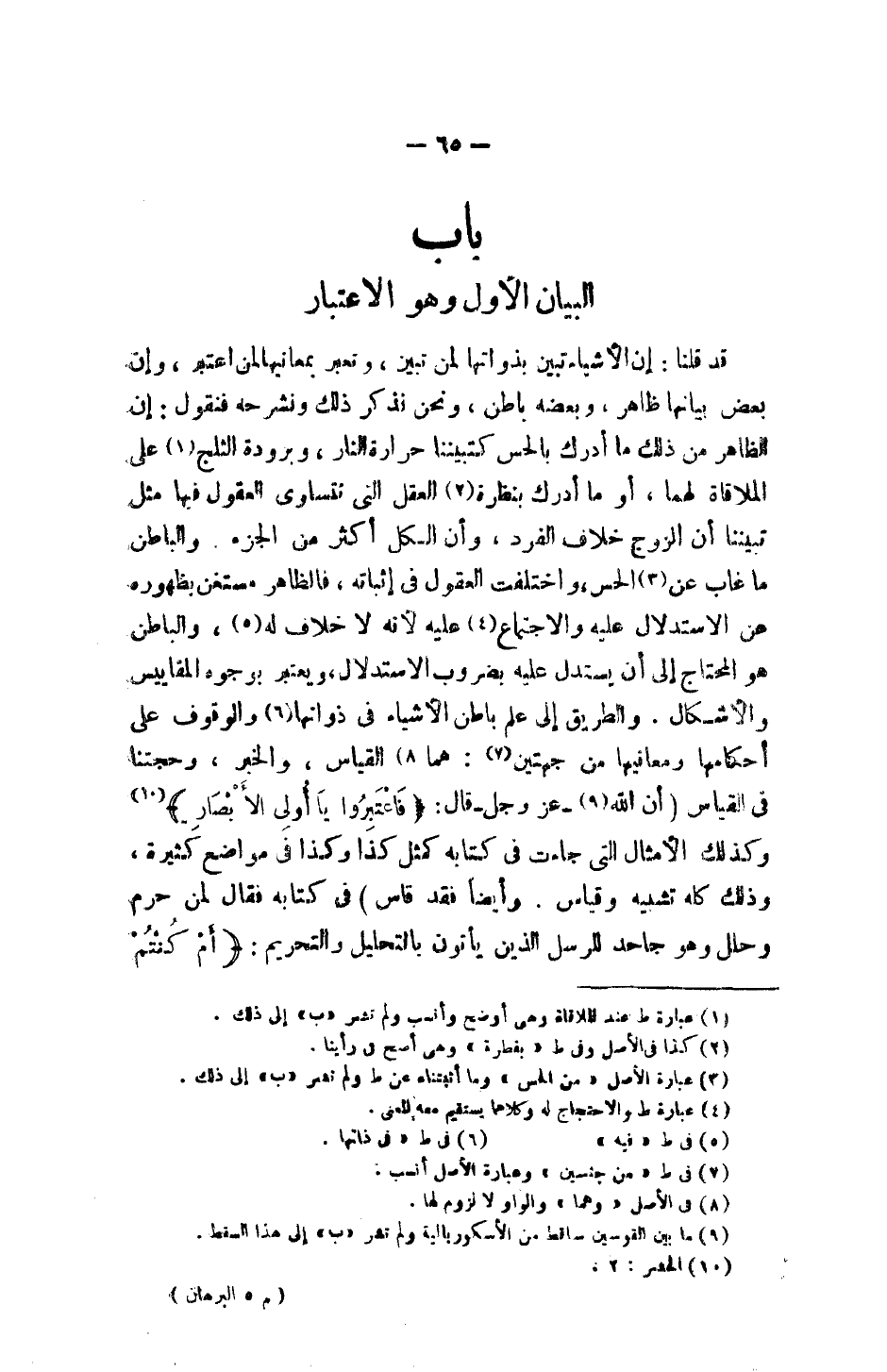 قد قلنا: إن الأشياء تبين بذواتها لمن تبين، وتعبر بمعانيها لمن اعتبر، وإن بعض بيانها ظاهر، وبعضه باطن، ونحن نذكر ذلك ونشرحه فنقول: إن الظاهر من ذلك ما أدرك بالحس كتبيننا حرارة النار، وبرودة الثلج على الملاقاة لهما، أو ما أدرك بنظره العقل التي تتساوى العقول فيها مثل تبيننا أن الزوج خلاف الفرد، وأن الكل أكثر من الجزء والباطن ما غاب عن الحس، واختلفت العقول في إ ثباته، فالظاهر مستغن بظهوره عن الاستدلال عليه والاجتماع عليه لأنه لا خلاف له، والباطن هو المحتاج إلى أن يستدل عليه بضروب الاستدلال، ويعتبر بوجوه المقاييس والأشكال. والطريق إلى علم باطن الأشياء في ذواتها والوقوف على أحكامها ومعانيها من جهتين هما: القياس، والخبر، وحجتنا في القياس (أن الله - عز وجل - قال: {فَاعْتَبِرُوا يَا أُولِي الأَبْصَارِ} وذلك الأمثال التي جاءت في كتابه كمثل كذا وكذا في مواضع كثيرة، وذلك كله تشبيه وقياس. وأيضاً فقد قاس) في كتابه فقال لمن حرم وحلل وهو جاحد للرسل الذي يأتون بالتحليل والتحريم: {أَمْ كُنتُمْ