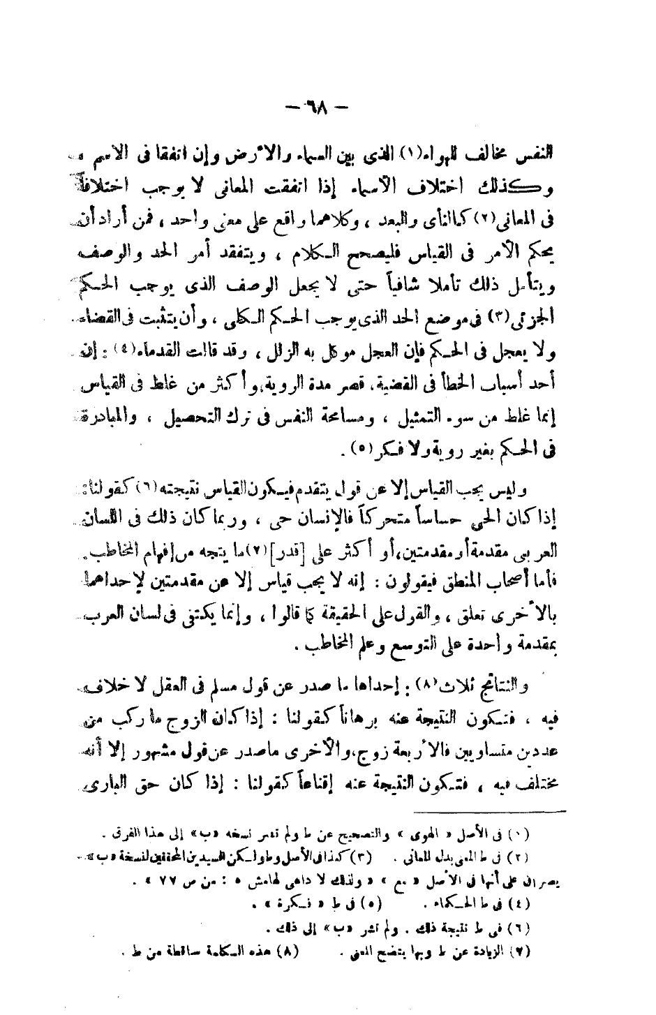 النفس مخالف للهواء الذي بين السماء والأرض وإن اتفقنا في الاسم، وكذلك اختلاف الأسماء إذا اتفقت المعاني لا يوجب اختلافاً في المعاني كالنأي والبعد، وكلاهما واقع على معنى واحد، فمن أراد أن يحكم الأمر في القياس فليصحح الكلام، ويتفقد أمر الحد والوصف ويتأمل ذلك تأملاً شافياً حتى لا يجعل الوصف الذي يوجب الحكم الجزئي في موضع الحد الذي يوجب الحكم الكلي، وأن يتثبت في القضاء ولا يعجل في الحكم فإن العجل موكل به الزلل، وقد قالت القدماء: إن أحد أسباب الخطأ في القضية، قصر مدة الروية، وأكثر من غلط في القياس إنما غلط في سوء التمثيل، ومسامحة النفس في ترك التحصيل، والمبادرة في الحكم بغير روية ولا فكر.