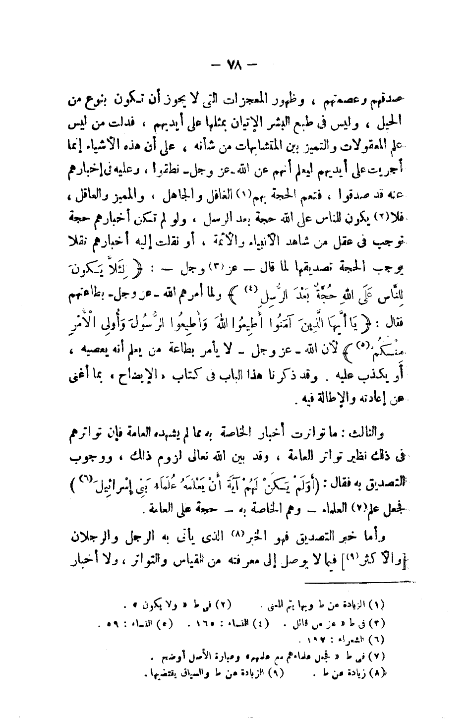 والثالث: ما تواترت أخبار الخاصة به مما لم يشهده العامة فإن تواترهم في ذلك نظير تواتر العامة، وقد بين الله تعالى لزوم ذلك، ووجوب التصديق به فقال: {أَوَلَمْ يَكُنْ لَهُمْ آيَةً أَنْ يَعْلَمَهُ عُلَمَاءُ بَنِي إِسْرَائِيلَ} فجعل علم العلماء - وهم الخاصة به - حجة على العامة.