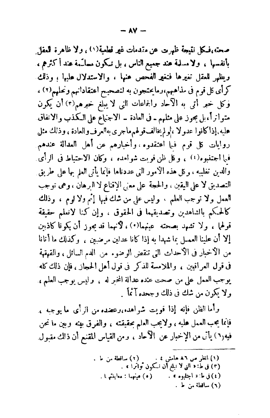 صحته، فكل نتيجة ظهرت عن مقدمات غير قطعية، ولا ظاهرة العقل بأنفسها، ولا مسلمة عند جميع الناس، بل تكون مسلمّة عند أكثرهم، ويظهر للعقل تغيرها فتغير الفحص عنها، والاستدلال عليها؛ وذلك كرأي كل قوم في مذاهبهم، وما يحتجون به لتصحيح اعتقاداتهم ونحلهم، وكل خبر أتى به الآحاد والجماعات التي لا يبلغ خبرهم أن يكون متواتراً، بل يجوز على مثلهم - في العادة - الاجتماع عن الكذب والاتفاق عليه، إذا كانوا عدولاً، ولم يخالف قولهم ما جرى به العرف والعادة، وذلك مثل روايات كل قوم فيما اعتقدوه، وأخبارهم عن أهل العدالة عندهم فيما اجتنبوه، وكل ظن قويت شواهده، وكان الاحتياط في الرأي والدين تغليبه، وكل هذه الأمور التي عددناها فإنما يأتي العلم بها على طريق التصديق لا على اليقين، والحجة على معنى الإقناع لا البرهان، وهي توجب العمل ولا توجب العلم، وليس على من شك فيها إثم ولا لوم، وذلك كالحكم بالشاهدين وتصديقهما في الحقوق، وإن كنا لا نعلم حقيقة قولهما، ولا تشهد بصحته عينهما، لأنهما قد يجوز أن يكونا كاذبين إلا أن علينا العمل بما شهدا به إذا كانا عدلين مرضيين، وكذلك ما أتانا من الأخبار في الأحداث التي تنقض الوضوء من الدم السائل، والقهقهة في قول العراقيين، والملامسة للذكر في قول أهل الحجاز، فإن ذلك كله يوجب العمل على من صحت عنده عدالة المخبر له، وليس يوجب العلم، ولا يكون من شك في ذلك وجحده آثماً.