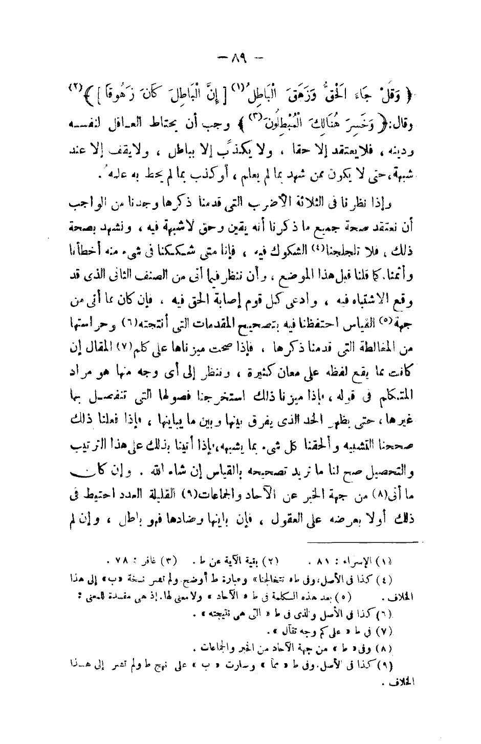وإذا نظرنا في الثلاثة الأضرب التي قدمنا ذكرها وجدنا من الواجب أن نعتقد صحة جميع ما ذكرنا أنه يقين وحق لا شبهة فيه، ونشهد بصحة ذلك فلا تلجلجنا الشكوك فيه، فإنا متى شككنا في شيء منه أخطأنا وأثمنا. كما قلنا قبل هذا الموضع، وأن ننظر فيما أتى من الصنف الثاني الذي قد وقع الاشتباه فيه، وادعى كل قوم إصابة الحق فيه، فإن كان مما أتى من جهة القياس احتفظنا فيه بتصحيح المقدمات التي انتجته وحراستها من المغالطة التي قدمنا ذكرها، فإذا صحت ميزناها على كلم المقال إن كانت مما يقع لفظه على معان كثيرة، وننظر إلى أي وجه منها هو مراد المتكلم في قوله، فإذا ميزنا ذلك استخرجنا فصولها التي تنفصل بها غيرها، حتى يظهر الحد الذي يفرق بينها وبين ما يباينها، فإذا فعلنا ذلك صححنا التشبيه وألحقنا كل شيء بما يشبهه، فإذا أتينا بذلك على هذا الترتيب والتحصيل صح لنا ما نريد تصحيحه بالقياس إن شاء الله. وإن كان ما أتى من جهة الخبر عن الآحاد والجماعات القليلة العدد احتيط في ذلك أولاً بعرضه على العقول، فإن باينها وضادها فهو باطل، وإن لم